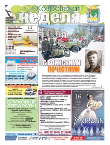 Àíàëîãîâûå ñëóõîâûå àïïàðàòû îò 5400 ðóá. Öèôðîâûå ñëóõîâûå àïïàðàòû ñ êîìïüþòåðíîé íàñòðîéêîé îò 9000 ðóá. Î ÏÐÎÒÈÂÎÏÎÊÀÇÀÍÈßÕ ÏÐÎÊÎÍÑÓËÜÒÈÐÓÉÒÅÑÜ ÑÎ ÑÏÅÖÈÀËÈÑÒÎÌ ÖÅÍÒÐ ÕÎÐÎØÅÃÎ ÑËÓÕÀ «ÐÀÄÓÃÀ ÇÂÓÊλ ÑËÓÕÎÂÛÅ ÀÏÏÀÐÀÒÛ Âîçìîæåí âûåçä íà äîì. Êîíñóëüòàöèÿ ñî ñïåöèàëèñòîì ïî òåë. 6-46-52, 8-906-562-2992 Àäðåñ: ã. Êîâðîâ, óë. Ôóðìàíîâà, 31 ÏÐÈ ÏÎÊÓÏÊÅ öèôðîâîãî ñëóõîâîãî àïïàðàòà: ïðîôåññèîíàëüíûé ïîäáîð – ÁÅÑÏËÀÒÍÎ êîìïüþòåðíàÿ íàñòðîéêà – ÁÅÑÏËÀÒÍÎ àóäèîãðàììà (ïðîâåðêà ïîòåðè ñëóõà) – ÁÅÑÏËÀÒÍÎ ðåêëàìà Читайте нашу газету на сайте kovrov-gorod.ru реклама №34 (469) 3 мая 2019 г. ● ШПОН FINE-LINE ● ПИЛОМАТЕРИАЛЫ (ЭКЗОТИКА) ● НАТУРАЛЬНЫЙ ШПОН ● МЕБЕЛЬНЫЙ ЩИТ ● КЛЕЙ, ГРУНТ, ЛАК ● ТЕРРАСНАЯ ДОСКА Северный проезд, д. 1 Лесоторговая база 2-42-02 2-46-31 8-919-022-02-99 8-919-022-02-88 8-919-022-02-77 8-919-022-02-33 КОМПАНИЯ ВУДСТОК реклама 8 (49232) 3-86-52 8 (904) 260-79-96 ПОВЕРКА СЧЕТЧИКОВ ВОДЫ И ГАЗА ИП Петрова Ю.Г. Аттестат аккредитации № RA.RU.320031 от 28.04.2017 В случае непригодности счетчика оплата за поверку не взимается ВЫБЕРИТЕ УДОБНОЕ ДЛЯ ВАС ВРЕМЯ реклама НА ДОМУ, БЕЗ СНЯТИЯ, БЕЗ НАРУШЕНИЯ ПЛОМБ Работаем с 8.00 до 21.00 без обеда и выходных Фото А. Соколова страница 3 реклама ðåêëàìà Вывоз ненужных вещей 8-910-17-63-564 Г зель. Грузчики. Недорого. ðåêëàìà ÃÐÓÇÎÏÅÐÅÂÎÇÊÈ неделя Ковровская Городская информационноаналитическая газета 12+ «Война не закончена, пока не похоронен последний солдат». Этим благородным девизом руководствуются современные поисковики. Благодаря работе поискового отряда «Память» из города Стрежевого Томской области, в городе воинской славы Коврове 30 апреля состоялась торжественная церемония похорон сержанта Александра Барышникова, летчика, погибшего в Калужской области 13 августа 1942 года. Через семь десятилетий останки бойца прибыли в родной город и со всеми воинскими почестями преданы земле на Аллее Почетных граждан Троицко-Никольского кладбища. С ВОИНСКИМИ ПОЧЕСТЯМИ