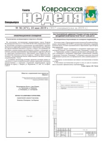 № 36 (471), 10 мая 2019 г. (№17 спецвыпуска за 2019 г.) ǺDzDZDzǸȌ ǸȜȐȞȜȐȟȘȎȭ Спецвыпуск Газета ИНФОРМАЦИОННОЕ СООБЩЕНИЕ О размещении нестационарного торгового объекта Во исполнение постановления администрации города Коврова Владимирской области от 15.02.2016 № 426 «Об утверждении порядка заключения договоров на размещение нестационарных торговых объектов на территории муниципального образования город Ковров, без предоставления земельного участка», в связи с поступившим обращением, администрация города Коврова сообщает о намерении заключить договор на размещение нестационарного торгового объекта на территории муниципального образования город Ковров без предоставления земельного участка по адресу: г. Ковров, Привокзальная площадь, для размещения киоска общественного питания, площадь для размещения - 8 кв.м. С условиями заключения договора, проектом договора можно ознакомится в отделе потребительского рынка управления экономики, имущественных и земельных отношений администрации города Коврова по адресу: г. Ковров, ул. Фурманова, 37, каб. 14, тел/факс. 3-48-37 ПОСТАНОВЛЕНИЕ АДМИНИСТРАЦИИ ГОРОДА КОВРОВА ВЛАДИМИРСКОЙ ОБЛАСТИ № 795 ОТ 12.04.2019 Г. Об утверждении документации по планировке территории В соответствии с Градостроительным кодексом Российской Федерации, заключением № 16/2019 о результатах публичных слушаний, руководствуясь Уставом муниципального образования город Ковров, постановляю: 1. Утвердить проект планировки и межевания территории ограниченной улицами: Стрелковая, Осипенко, Планерная, 1-я Боровая. 2. Управлению делами и кадрами организовать публикацию проекта планировки и межевания территории ограниченной улицами: Стрелковая, Осипенко, Планерная, 1-я Боровая в средствах массовой информации и разместить на официальном сайте администрации города. 3. Контроль за исполнением настоящего постановления оставляю за собой. 4. Настоящее постановление вступает в силу со дня его подписания и подлежит официальному опубликованию. Глава города А.В. Зотов