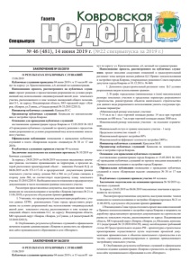 № 46 14 июня 2019 г. 2 ЗАКЛЮЧЕНИЕ № 57/2019 О РЕЗУЛЬТАТАХ ПУБЛИЧНЫХ СЛУШАНИЙ 13.06.2019 Публичные слушания проведены 04 июня 2019 г. в 15 часов 10 минут по адресу: ул. Краснознаменная, д.6, актовый зал администрации. Наименование проекта, рассмотренного на публичных слушаниях: проект решения о предоставлении разрешения на условно разрешенный вид использования «индивидуальный жилой дом» земельного участка, расположенного в общественно-деловой зоне центра города Ц-1, по адресу: Владимирская область, МО городской округ г.Ковров, г.Ковров, ул.Дружбы, д.7 (кадастровый № 33:20:014801:1). Инициатор публичных слушаний: Соколова Л.И., Пурецкая Л.В., Пурецкий В.Н. Организатор публичных слушаний: Комиссия по землепользованию и застройке города Коврова. Основание для проведения публичных слушаний: постановление администрации города Коврова от 15.05.2019 № 1030 «О проведении публичных слушаний по проекту решения о предоставлении разрешения на условно разрешенный вид использования земельного участка». Официальная публикация оповещения о проведении публичных слушаний в газете «Ковровская неделя» спецвыпуск № 38 от 17 мая 2019г. В публичных слушаниях приняли участие 44 человека Заключение подготовлено на основании протокола № 57/2019 публичных слушаний. За период с 24.05.2019 по 06.06.2019 письменные замечания и предложения не поступили. Рассмотрев представленные документы, выслушав мнение членов комиссии по землепользованию и застройке г.Коврова (протокол № 21 от 11.06.2019), в результате обсуждения принято решение: I. Рекомендовать Главе города предоставить разрешение на условно разрешенный вид использования «индивидуальный жилой дом» земельного участка, расположенного в общественно-деловой зоне центра города Ц-1, по адресу: Владимирская область, МО городской округ г.Ковров, г.Ковров, ул.Дружбы, д.7 (кадастровый № 33:20:014801:1). II. Опубликовать результаты публичных слушаний в официальном печатном издании администрации г.Коврова и разместить на официальном сайте муниципального образования в сети «Интернет». ЗАКЛЮЧЕНИЕ № 58/2019 О РЕЗУЛЬТАТАХ ПУБЛИЧНЫХ СЛУШАНИЙ 13.06.2019 Публичные слушания проведены 04 июня 2019 г. в 15 часов 15 минут по адресу: ул. Краснознаменная, д.6, актовый зал администрации. Наименование проекта, рассмотренного на публичных слушаниях: проект внесения следующих изменений в градостроительный регламент территории садоводческих участков ЖС Правил землепользования и застройки города Коврова, утвержденных решением Совета народных депутатов города Коврова от 01.12.2011г. № 460: В графе «предельные (минимальные и (или) максимальные) размеры земельных участков и предельные параметры разрешенного строительства, реконструкции объектов капитального строительства» для основного вида разрешенного использования «садовые дома» фразу: «Расстояние между фронтальной границей участка и основным строением - 5м» изложить в следующей редакции: «Расстояние между фронтальной границей участка и основным строением - не менее 3м». Инициатор публичных слушаний: Баскаков В.И. Организатор публичных слушаний: Комиссия по землепользованию и застройке города Коврова. Основание для проведения публичных слушаний: постановление администрации города Коврова от 15.05.2019 № 1031 «О проведении публичных слушаний по проекту внесения изменений в Правила землепользования и застройки города Коврова». Официальная пуб