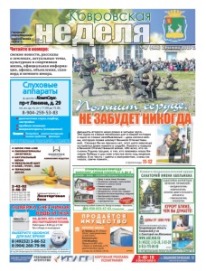 свежие новости, рассказы о земляках, актуальные темы, культурная и спортивная жизнь, официальная информация, афиша, объявления, сканворд и немного юмора. Читайте в номере: №47 (482) 21 июня 2019 г. Фото И. Волкова неделя Ковровская Городская информационноаналитическая газета 12+ страницы 11-12 ● ШПОН FINE-LINE ● ПИЛОМАТЕРИАЛЫ (ЭКЗОТИКА) ● НАТУРАЛЬНЫЙ ШПОН ● МЕБЕЛЬНЫЙ ЩИТ ● КЛЕЙ, ГРУНТ, ЛАК ● ТЕРРАСНАЯ ДОСКА Северный проезд, д. 1 Лесоторговая база 2-42-02 2-46-31 8-919-022-02-99 8-919-022-02-88 8-919-022-02-77 8-919-022-02-33 КОМПАНИЯ ВУДСТОК реклама 8 (49232) 3-86-52 8 (904) 260-79-96 ПОВЕРКА СЧЕТЧИКОВ ВОДЫ И ГАЗА ИП Петрова Ю.Г. Аттестат аккредитации № RA.RU.320031 от 28.04.2017 В случае непригодности счетчика оплата за поверку не взимается ВЫБЕРИТЕ УДОБНОЕ ДЛЯ ВАС ВРЕМЯ реклама НА ДОМУ, БЕЗ СНЯТИЯ, БЕЗ НАРУШЕНИЯ ПЛОМБ Работаем с 8.00 до 21.00 без обеда и выходных в ЦЕНТРЕ «КомпСлух» пр-т Ленина, д. 29 пн, вт, ср, чт, пт с 11.00 до 15.00, 8-904-259-53-83 ÈÌÅÞÒÑß ÏÐÎÒÈÂÎÏÎÊÀÇÀÍÈß. ÏÐÎÊÎÍÑÓËÜÒÈÐÓÉÒÅÑÜ ÑÎ ÑÏÅÖÈÀËÈÑÒÎÌ  диагностика слуха,подбор, настройка  пробное ношение  микроаппараты (невидимки) Продажа:  батарейки  ушные вкладыши  тонкие трубочки  фильтры Слуховые аппараты ðåêëàìà реклама СТРОИТЕЛЬН БРИГ Д ВЫПОЛНИТ ЛЮБЫЕ Р БОТЫ от до Ремонт квартир любой сложности. Выезд на замеры – бесплатно. 8-930-033-47-43, Станислав ðåêëàìà НЕ ЗАБУДЕТ НИКОГДА Двадцать второго июня ровно в четыре часа... Это одна из самых печальных дат в нашей истории и одна из самых незабываемых – день начала войны, которую позже назовут Великой Отечественной. Сколько бы ни прошло лет, этот дата навсегда останется Днем памяти и скорби. Памяти о павших в Великой Отечественной войне, обо всех, кто заслонил Родину грудью, о тех, кто завоевал нашу Великую Победу и дал нам счастье жить под мирным небом. В их честь – цветы к монументам, слезы на глазах, свечи памяти... Ïîìíèò ñåðäöå, НЕЖИЛОЕ ЗДАНИЕ, ул. Правды, д. 51, площадь – 234,8 м2, кадастровый номер: 33:20:011610:47. Начальная цена – 2 958 000 рублей. Обращаться в МУП «САХ»: г. Ковров, ул. Грибоедова, д.129, административное здание, 2-й этаж, тел.: 8 (49232) 5-49-20. ПРОД ЁТС ИМУЩЕСТВО реклама
