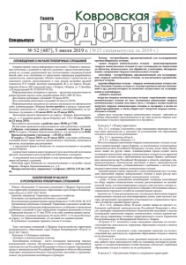 № 52 (487), 5 июля 2019 г. (№25 спецвыпуска за 2019 г.) ǺDzDZDzǸȌ ǸȜȐȞȜȐȟȘȎȭ Спецвыпуск Газета ОПОВЕЩЕНИЕ О НАЧАЛЕ ПУБЛИЧНЫХ СЛУШАНИЙ Администрация города информирует население г. Коврова о проведении публичных слушаний по проекту решения о предоставлении разрешения на условно разрешенный вид использования «индивидуальный жилой дом» и на отклонение от предельных параметров разрешенного строительства, реконструкции объекта капитального строительства на земельном участке, расположенном в зоне жилой застройки средней этажности (5-8 этажей, включая мансардный) Ж-2, по адресу: Владимирская область, МО городской округ г. Ковров, г.Ковров, ул. 5 Декабря, д.16 (кадастровый № 33:20:014716:16). Информационные материалы к проекту – проектная документация на реконструкцию жилого дома, разработанная ООО «ПФ ЭСТех». Дата начала публичных слушаний: 05 июля 2019г. Дата окончания публичных слушаний: 02 августа 2019г. Информационные материалы по проекту размещены на официальном сайте администрации г.Коврова kovrov-gorod.ru в разделе «градостроительная деятельность», подраздел «проекты, рассматриваемые на публичных слушаниях» с 12 июля 2019г. по 25 июля 2019г. Экспозиция проекта проводится по адресу: г.Ковров, Краснознаменная ул., д. 6 (администрация города Коврова), каб. 310 с 12 июля 2019г. по 23 июля 2019г. Часы работы экспозиции: в рабочие дни с 08:00 до 17:00. На выставке проводятся консультации по теме публичных слушаний. Собрание участников публичных слушаний состоится 23 июля 2019г. по адресу: г.Ковров, Краснознаменная ул., д.6, актовый зал в 10:00. Время регистрации участников – с 09:30 до 10:00. В период с 12 июля 2019г. по 25 июля 2019г. участники публичных слушаний имеют право вносить предложения и замечания, касающиеся проектов, подлежащих рассмотрению: - в письменной форме в Комиссию по землепользованию и застройке города Коврова; - посредством записи в книге (журнале) учета посетителей экспозиции проекта, подлежащего рассмотрению на публичных слушаниях; - в письменной или устной форме в ходе проведения собрания участников публичных слушаний. Почтовый адрес Комиссии по землепользованию и застройке города Коврова: г.Ковров, Краснознаменная ул., д. 6 Номера контактных справочных телефонов: (49232) 3-25-46; 3-0966. ЗАКЛЮЧЕНИЕ № 06/2019 О РЕЗУЛЬТАТАХ ПУБЛИЧНЫХ СЛУШАНИЙ Объект обсуждения: О внесении изменений в Правила благоустройства территории муниципального образования город Ковров Владимирской области от 26.07.2017 №162. Заказчик, инициатор: Управление городского хозяйства. Основание для проведения публичных слушаний: Постановление администрации города Коврова от 31.05.2019г. № 1233 Организатор публичных слушаний: Управление городского хозяйства. Официальная публикация информационного сообщения о проведении публичных слушаний и текст выносимых поправок размещены в газете «Ковровская неделя» от 31 мая 2019г. и на сайте администрации города. Публичные слушания проведены 26 июня 2019 г. в 14 часов 00 минут по адресу: ул. Краснознаменная, д.6, актовый зал администрации. В публичных слушаниях приняли участие 8 человек. Текст вносимых изменений в Правила благоустройства территории муниципального образования город Ковров Владимирской области от 26.07.2017 №162: В разделе 2 «Основные понятия»: - изложить в новой редакции понятия: Контейнерная площадка - место (площадка) накопления твердых коммунальных отходов, обустроенное в соответствии 