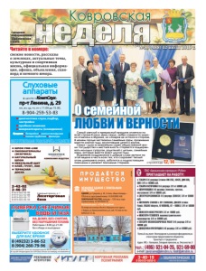свежие новости, рассказы о земляках, актуальные темы, культурная и спортивная жизнь, официальная информация, афиша, объявления, сканворд и немного юмора. Читайте в номере: №53 (488) 12 июля 2019 г. НЕЖИЛОЕ ЗДАНИЕ С ЗЕМЕЛЬНЫМ УЧАСТКОМ: ЗДАНИЕ, ул. Суворова, д. 28, 2 этажа, общая площадь – 570,6 кв.м, кадастровый номер: 33:20:010905:420. ЗЕМЕЛЬНЫЙ УЧАСТОК, площадь – 1292 кв.м, кадастровый номер: 33:20:010905:18. Начальная цена – 4 720 160 рублей. По вопросам осмотра объекта обращаться по адресу: г. Ковров, ул. Краснознамённая, д.6, каб. 412 или по тел.: 8(49232)3-51-26. реклама ПРОД ЁТС ИМУЩЕСТВО ðåêëàìà неделя Ковровская Городская информационноаналитическая газета 12+ ● ШПОН FINE-LINE ● ПИЛОМАТЕРИАЛЫ (ЭКЗОТИКА) ● НАТУРАЛЬНЫЙ ШПОН ● МЕБЕЛЬНЫЙ ЩИТ ● КЛЕЙ, ГРУНТ, ЛАК ● ТЕРРАСНАЯ ДОСКА Северный проезд, д. 1 Лесоторговая база 2-42-02 2-46-31 8-919-022-02-99 8-919-022-02-88 8-919-022-02-77 8-919-022-02-33 КОМПАНИЯ ВУДСТОК реклама 8 (49232) 3-86-52 8 (904) 260-79-96 ПОВЕРКА СЧЕТЧИКОВ ВОДЫ И ГАЗА ИП Петрова Ю.Г. Аттестат аккредитации № RA.RU.320031 от 28.04.2017 В случае непригодности счетчика оплата за поверку не взимается ВЫБЕРИТЕ УДОБНОЕ ДЛЯ ВАС ВРЕМЯ реклама НА ДОМУ, БЕЗ СНЯТИЯ, БЕЗ НАРУШЕНИЯ ПЛОМБ Работаем с 8.00 до 21.00 без обеда и выходных в ЦЕНТРЕ «КомпСлух» пр-т Ленина, д. 29 пн, вт, ср, чт, пт с 11.00 до 15.00, 8-904-259-53-83 ÈÌÅÞÒÑß ÏÐÎÒÈÂÎÏÎÊÀÇÀÍÈß. ÏÐÎÊÎÍÑÓËÜÒÈÐÓÉÒÅÑÜ ÑÎ ÑÏÅÖÈÀËÈÑÒÎÌ  диагностика слуха,подбор, настройка  пробное ношение  микроаппараты (невидимки) Продажа:  батарейки  ушные вкладыши  тонкие трубочки  фильтры Слуховые аппараты ðåêëàìà страницы 12, 14 Самый светлый и прекрасный праздник отметили по всей стране 8 июля. День семьи, любви и верности широко отмечали в Муроме, но и Ковров не остался в стороне. В нашем городе чествовали семейные пары, прожившие вместе многие годы, воспитавшие детей и внуков. Семья – одна из важнейших скреп общественной жизни. Государство и местная власть стараются поддерживать молодых супругов, родителей с детьми, семейные пары, которые вместе живут долгие годы. Искренние поздравления и добрые слова звучали на этой неделе в честь всех тех, кто сохраняет теплый огонь домашнего очага, заботится о подрастающем поколении и уважает поколение старшее. О семейной ЛЮБВИ И ВЕРНОСТИ