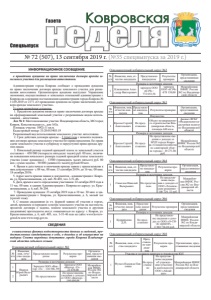 № 72 (507), 13 сентября 2019 г. (№35 спецвыпуска за 2019 г.) ǺDzDZDzǸȌ ǸȜȐȞȜȐȟȘȎȭ Спецвыпуск Газета ИНФОРМАЦИОННОЕ СООБЩЕНИЕ о проведении аукциона на право заключения договора аренды земельного участка для размещения автостоянки. Администрация города Коврова сообщает о проведении аукциона на право заключения договора аренды земельного участка для размещения автостоянки. Организатором аукциона выступает Управление экономики, имущественных и земельных отношений администрации г. Коврова на основании постановления администрации города Коврова № 11.09.2019 от 2171 «О проведении аукциона на право заключения договора аренды земельного участка». Условия проведения аукциона: 1. Предметом аукциона является право заключения договора аренды на сформированный земельный участок с разрешенным видом использования – автостоянка. Лот № 1: Местоположение участка: Владимирская область, МО город Ковров, Комсомольская ул., дом 163а. Площадь участка: 1042±11 кв.м. Кадастровый номер: 33:20:015403:19 Разрешенный вид использования земельного участка: автостоянка. 2. Срок действия договора аренды – 3 (три) года с момента подписания договора аренды земельного участка без права продления, без права сдачи земельного участка в субаренду и переуступки права аренды другим лицам. 3. Начальный размер годовой арендной платы за земельный участок составляет – 450 000 (четыреста пятьдесят тысяч) руб. 00 коп.; величина повышения начального размера годовой арендной платы земельного участка («шаг аукциона») – 13500 (тринадцать тысяч пятьсот) руб. 00 коп.; сумма задатка – 90 000 (девяносто тысяч) рублей 00 коп. 4. Время и дата начала и окончания приема заявок с прилагаемыми к ним документами - с 08 час. 00 мин. 13 сентября 2019г. до 16 час. 00 мин. 18 октября 2019г. 5. Адрес места приема заявок и документов - администрация г. Коврова, ул. Краснознаменная, д.6, каб. № 403, тел. 3-51-46. 6. Дата, время и место определения участников: 22 октября 2019 года в 11 час. 00 мин. в здании Администрации г. Коврова по адресу: ул. Краснознаменная, д. 6, каб. № 204. 7. Проведение аукциона: 23 октября 2019 года в 10 час. 30 мин. в здании администрации г. Коврова, ул. Краснознаменная, д. 6, малый зал (третий этаж). 8. С иными сведениями (в т.ч. формой заявки об участии в торгах, датой, временем и порядком осмотра земельного участка на местности, проектом договора о задатке, планом земельного участка и другими сведениями) претенденты могут ознакомиться по адресу: г. Ковров, ул. Краснознаменная, д. 6, каб. 403, тел. 3-51-46 или на сайте www.kovrovgorod.ru или www.torgi.gov.ru. СВЕДЕНИЯ о выявленных фактах недостоверности данных и сведений, предоставленных кандидатами о себе, о доходах и об имуществе на выборах Совета народных депутатов города Коврова Владимирской области седьмого созыва Одномандатный избирательный округ №1 № п/п Фамилия, имя, отчество кандидата Представлено кандидатом Результаты проверки Организация, представившая сведения Размеры и источники доходов 1 Иванов Юрий Валерьевич Зарплата ООО «Вектор -33» – 136 586, 99 Зарплата ООО «Вектор -33» – 23 670,00 Межрайонная ИФНС России №2 по Владимирской области 2 Не представлено Не представлены сведения о доходах от ООО «Вектор» – 144 684,04 Одномандатный избирательный округ №2 № п/п Фамилия, имя, отчество кандидата Представлено кандидатом Результаты проверки Организация, представившая сведения Размеры и источники доходов 1 Клюшенков Алек- сандр Викт
