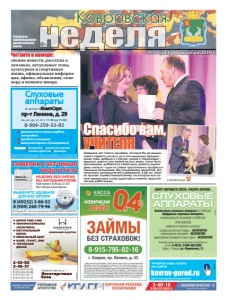 свежие новости, рассказы о земляках, актуальные темы, культурная и спортивная жизнь, официальная информация, афиша, объявления, сканворд и немного юмора. Читайте в номере: №79 (514) 11 октября 2019 г. неделя Ковровская Городская информационноаналитическая газета 12+ ● ШПОН FINE-LINE ● ПИЛОМАТЕРИАЛЫ (ЭКЗОТИКА) ● НАТУРАЛЬНЫЙ ШПОН ● МЕБЕЛЬНЫЙ ЩИТ ● КЛЕЙ, ГРУНТ, ЛАК ● ТЕРРАСНАЯ ДОСКА Северный проезд, д. 1 Лесоторговая база 2-42-02 2-46-31 8-919-022-02-99 8-919-022-02-88 8-919-022-02-77 8-919-022-02-33 КОМПАНИЯ ВУДСТОК реклама 8 (49232) 3-86-52 8 (904) 260-79-96 ПОВЕРКА СЧЕТЧИКОВ ВОДЫ И ГАЗА ИП Петрова Ю.Г. Аттестат аккредитации № RA.RU.320031 от 28.04.2017 В случае непригодности счетчика оплата за поверку не взимается ВЫБЕРИТЕ УДОБНОЕ ДЛЯ ВАС ВРЕМЯ реклама НА ДОМУ, БЕЗ СНЯТИЯ, БЕЗ НАРУШЕНИЯ ПЛОМБ Работаем с 8.00 до 21.00 без обеда и выходных в ЦЕНТРЕ «КомпСлух» пр-т Ленина, д. 29 пн, вт, ср, чт, пт с 11.00 до 15.00, 8-904-259-53-83 ÈÌÅÞÒÑß ÏÐÎÒÈÂÎÏÎÊÀÇÀÍÈß. ÏÐÎÊÎÍÑÓËÜÒÈÐÓÉÒÅÑÜ ÑÎ ÑÏÅÖÈÀËÈÑÒÎÌ диагностика слуха,подбор, настройка пробное ношение микроаппараты (невидимки) Продажа: батарейки ушные вкладыши тонкие трубочки фильтры Слуховые аппараты ðåêëàìà Àíàëîãîâûå ñëóõîâûå àïïàðàòû îò 5400 ðóá. Öèôðîâûå ñëóõîâûå àïïàðàòû ñ êîìïüþòåðíîé íàñòðîéêîé îò 9000 ðóá. Î ÏÐÎÒÈÂÎÏÎÊÀÇÀÍÈßÕ ÏÐÎÊÎÍÑÓËÜÒÈÐÓÉÒÅÑÜ ÑÎ ÑÏÅÖÈÀËÈÑÒÎÌ ÖÅÍÒÐ ÕÎÐÎØÅÃÎ ÑËÓÕÀ «ÐÀÄÓÃÀ ÇÂÓÊλ ÑËÓÕÎÂÛÅ ÀÏÏÀÐÀÒÛ Âîçìîæåí âûåçä íà äîì. Êîíñóëüòàöèÿ ñî ñïåöèàëèñòîì ïî òåë. 6-46-52, 8-906-562-2992 Àäðåñ: ã. Êîâðîâ, óë. Ôóðìàíîâà, 31 ÏÐÈ ÏÎÊÓÏÊÅ öèôðîâîãî ñëóõîâîãî àïïàðàòà: ïðîôåññèîíàëüíûé ïîäáîð – ÁÅÑÏËÀÒÍÎ êîìïüþòåðíàÿ íàñòðîéêà – ÁÅÑÏËÀÒÍÎ àóäèîãðàììà (ïðîâåðêà ïîòåðè ñëóõà) – ÁÅÑÏËÀÒÍÎ ðåêëàìà реклама Читайте нашу газету на сайте kovrov-gorod.ru реклама http://kovrov-gorod.ru/newspaper.html Наверное нет такого человека, который бы не помнил своего первого учителя, да и последующих предметников тоже. Добрые и строгие, умные и терпеливые – педагоги давали нам знания на всю жизнь, учили быть прилежными, добиваться своей цели, решать задачи. День учителя – один из самых трогательных профессиональных праздников. Мы поздравляем педагогов, воспитателей, руководителей учреждений. В ДК им. Ленина прошел торжественный вечер, на котором все самые прекрасные слова адресовали именно педагогическим работникам. Спасибо вам, УЧИТЕЛЯ страница 12