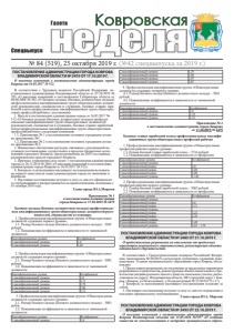 № 84 25 октября 2019 г. 32 ПОСТАНОВЛЕНИЕ АДМИНИСТРАЦИИ ГОРОДА КОВРОВА ВЛАДИМИРСКОЙ ОБЛАСТИ № 2497 ОТ 22.10.2019 Г. О внесении изменений в постановление администрации города Коврова от 30.09.2019 № 2310 «Об утверждении муниципальной программы «Управление муниципальным имуществом и земельными ресурсами в городе Коврове». В целях повышения эффективности владения, пользования и распоряжения имуществом, находящимся в собственности муниципального образования город Ковров, в соответствии с Федеральным законом от 06.10.2003 № 131-ФЗ «Об общих принципах организации местного самоуправления в Российской Федерации», руководствуясь Уставом муниципального образования город Ковров, Общим порядком управления и распоряжения муниципальной собственностью г.Коврова, утвержденным решением Ковровского городского Совета народных депутатов от 17.01.2001 № 2/1 (с изменениями и дополнениями), постановляю: 1. Внести в приложения к постановлению администрации г. Коврова от 30.09.2019 № 2310 «Об утверждении муниципальной программы «Управление муниципальным имуществом и земельными ресурсами в городе Коврове» следующие изменения: 1.1. В разделе «Паспорт муниципальной программы» строку «Объем бюджетных ассигнований на реализацию муниципальной программы» изложить в следующей редакции: Объем бюджетных ассигнований на реализацию муниципальной программы Финансирование программы планируется осуществить за счет средств местного бюджета. В целом на реализацию мероприятий Программы в течение будет привлечено – 45851 тыс.руб., в том числе: 2019 г. – 17567 тыс.руб. 2020 г. - 14142 тыс.руб. 2021 г.- 14142 тыс.руб. 1.2. В разделе «Паспорт муниципальной программы» строку «Ответственные лица для контактов» изложить в следующей редакции: Ответственные лица для контактов М.В. Филатов – начальник управления экономики, имущественных и земельных отношений администрации г. Коврова, тел. 3-51-73 1.3. В разделе 8 «Ресурсное обеспечение» абзац 4 изложить в следующей редакции: «Общий объем финансирования средств на реализацию программы планируется из бюджета города Коврова в объеме 45851 тыс.руб., в том числе: 2019 г. – 17567 тыс.руб. 2020 г. - 14142 тыс.руб. 2021 г.- 14142 тыс.руб. 1.4. В разделе «Подпрограмма 1» строку «Объем бюджетных ассигнований на реализацию муниципальной программы» изложить в следующей редакции: Объем бюджетных ассигнований на реализацию муниципальной программы Финансирование программы планируется осуществить за счет средств местного бюджета. В целом на реализацию мероприятий Программы в течение 2019-2021 г.г. будет привлечено – 42796 тыс.руб., в том числе: 2019 г. – 16112 тыс.руб. 2020 г. – 13342 тыс.руб. 2021 – 13342 тыс.руб. 1.5. В разделе «Подпрограмма 1» строку «Ответственные лица для контактов» изложить в следующей редакции: Ответственные лица для контактов М.В. Филатов – начальник управления экономики, имущественных и земельных отношений администрации г. Коврова, тел. 3-51-73 1.6. В разделе 8 «Ресурсное обеспечение» абзац 4 изложить в следующей редакции: «Общий объем финансирования средств на реализацию подпрограммы планируется из бюджета города Коврова в объеме 42796 тыс.руб., в том числе: 2019 г. – 16112 тыс.руб. 2020 г. – 13342 тыс.руб. 2021 г. – 13342 тыс.руб. 1.7. В разделе «Подпрограмма 2» строку «Ответственные лица для контактов» изложить в следующей редакции: Ответственные лица для контактов М.В. Филатов – начальник управления экономики, имущественны