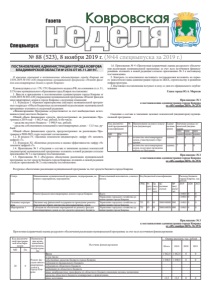 № 88 (523), 8 ноября 2019 г. (№44 спецвыпуска за 2019 г.) ǺDzDZDzǸȌ ǸȜȐȞȜȐȟȘȎȭ Спецвыпуск Газета ПОСТАНОВЛЕНИЕ АДМИНИСТРАЦИИ ГОРОДА КОВРОВА ВЛАДИМИРСКОЙ ОБЛАСТИ № 2576 ОТ 05.11.2019 Г. О внесении изменений в постановление администрации города Коврова от 18.04.2019 № 843 «Об утверждении муниципальной программы «Ремонт фасадов многоквартирных домов в городе Коврове» Руководствуясь ст.ст. 179, 179.3 Бюджетного кодекса РФ, на основании ст.ст. 31, 32 Устава муниципального образования город Ковров постановляю: 1. Внести в приложение к постановлению администрации города Коврова от 18.04.2019 № 843 «Об утверждении муниципальной программы «Ремонт фасадов многоквартирных домов в городе Коврове» следующие изменения: 1.1. В разделе I. «Краткая характеристика (паспорт) муниципальной программы» подраздел «Объем бюджетных ассигнований на реализацию муниципальной программы» изложить в следующей редакции: «Финансирование Программы осуществляется за счет внебюджетных источников и (или) местного бюджета. Общий объем финансовых средств, предусмотренных на реализацию Программы в 2019 году – 1 062,4 тыс. рублей, в том числе: - средства местного бюджета – 1 048,9 тыс. рублей; - средства собственников помещений в многоквартирных домах – 13,5 тыс. рублей. Общий объем финансовых средств, предусмотренных на реализацию Программы в 2020-2021 годах подлежит согласованию. 1.2. В разделе IV. «Целевые показатели (индикаторы)»: цифру «9» заменить цифрой «7». 1.3. В разделе XI. «Конечные результаты и оценка эффективности» цифру «9» заменить цифрой «7». 1.4. Приложение № 1 «Сведения о составе и значениях целевых показателей (индикаторов) муниципальной программы» изложить в новой редакции согласно приложению № 1 к настоящему постановлению. 1.5. Приложение № 3 «Ресурсное обеспечение реализации муниципальной программы за счет средств бюджета города Коврова» изложить в новой редакции согласно приложению № 2 к настоящему постановлению. 1.6. Приложение № 4 «Прогнозная (справочная) оценка ресурсного обеспечения реализации муниципальной программы за счет всех источников финансирования» изложить в новой редакции согласно приложению № 3 к настоящему постановлению. 2. Контроль за исполнением настоящего постановления возложить на первого заместителя главы администрации города по ЖКХ, строительству и развитию инфраструктуры. 3. Настоящее постановление вступает в силу со дня его официального опубликования. Глава города Ю.А. Морозов Приложение № 1 к постановлению администрации города Коврова от «05» ноября 2019г. № 2576 Сведения о составе и значениях целевых показателей (индикаторов) муниципальной программы Код аналитической программной классификации № п/п Наименование целевого показателя (индикатора) Единица измерения Значения целевых показателей (индикаторов) 2019 2020 2021 МП Пп оценка оценка оценка 20 0 1 количество многоквартирных домов, учавствующих в Программе единиц 7 0 0 2 количество многоквартирных домов, на которых проведены работы по Программе единиц 7 0 0 Приложение № 2 к постановлению администрации города Коврова от «05» ноября 2019г. № 2576 Ресурсное обеспечение реализации муниципальной программы за счет средств бюджета города Коврова Статус Наименование муниципальной программы, подпрограммы, основного мероприятия, мероприятия Ответственный исполнитель, соисполнитель Код бюджетной классификации Расходы бюджета го