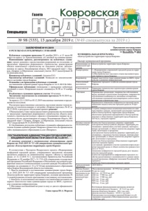 № 98 (533), 13 декабря 2019 г. (№49 спецвыпуска за 2019 г.) ǺDzDZDzǸȌ ǸȜȐȞȜȐȟȘȎȭ Спецвыпуск Газета ЗАКЛЮЧЕНИЕ № 91/2019 О РЕЗУЛЬТАТАХ ПУБЛИЧНЫХ СЛУШАНИЙ Публичные слушания проведены 03 декабря 2019 г. в 15 часов 00 минут по адресу: ул. Краснознаменная, д.6, актовый зал администрации. Наименование проекта, рассмотренного на публичных слушаниях: проект решения о предоставлении разрешения на отклонение от предельных параметров разрешенного строительства, реконструкции объекта капитального строительства на земельном участке, расположенном по адресу: Владимирская область, МО городской округ г. Ковров, г.Ковров, ул.Муромская, земельный участок 18/27 (кадастровый № 33:20:014201:416). Инициатор публичных слушаний: Антипов П.О. Организатор публичных слушаний: Комиссия по землепользованию и застройке города Коврова. Основание для проведения публичных слушаний: постановление администрации города Коврова от 14.11.2019 № 2684. Официальная публикация оповещения о проведении публичных слушаний в газете «Ковровская неделя» спецвыпуск № 90 от 15 ноября 2019г. В публичных слушаниях приняли участие 10 человек Заключение подготовлено на основании протокола № 91/2019 публичных слушаний. За период с 22.11.2019 по 05.12.2019 письменные замечания и предложения не поступили. Рассмотрев представленные документы, выслушав мнение членов комиссии по землепользованию и застройке г.Коврова (протокол № 42 от 09.12.2019), в результате обсуждения принято решение: I.Рекомендовать Главе города предоставить разрешение на отклонение от предельных параметров разрешенного строительства объекта капитального строительства (склада с офисом и помещением охраны) на земельном участке, расположенном по адресу: Владимирская область, МО городской округ г. Ковров, г.Ковров, ул.Муромская, земельный участок 18/27 (кадастровый № 33:20:014201:416). II. Опубликовать результаты публичных слушаний в официальном печатном издании администрации г.Коврова и разместить на официальном сайте муниципального образования в сети «Интернет». ПОСТАНОВЛЕНИЕ АДМИНИСТРАЦИИ ГОРОДА КОВРОВА ВЛАДИМИРСКОЙ ОБЛАСТИ № 2834 ОТ 06.12.2019 Г. О внесении изменений в постановление администрации города Коврова от 29.03.2019 № 713 «Об утверждении муниципальной программы «Благоустройство территории города Коврова» В соответствии с Паспортом Федерального проекта «Формирование комфортной городской среды», утвержденного протоколом заседания проектного комитета по национальному проекту «Жилье и городская среда» от 21.12.2018 N 3, постановлением Правительства Российской Федерации от 30 декабря 2017 г. N 1710 «Об утверждении государственной программы Российской Федерации «Обеспечение доступным и комфортным жильем и коммунальными услугами граждан Российской Федерации» на основании ст. 31 и 32 Устава муниципального образования город Ковров Владимирской области постановляю: 1. Внести изменения в постановление администрации города Коврова от 29.03.2019 № 713 «Об утверждении муниципальной программы «Благоустройство территории города Коврова», изложив приложение № 1 в новой редакции согласно приложению к настоящему постановлению. 2. Контроль за исполнением настоящего постановления возложить на первого заместителя главы администрации города по ЖКХ, строительству и развитию инфраструктуры. 3. Настоящее постановление вступает в силу со дня его официального опубликования. Глава города Ю.А.