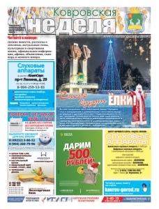 свежие новости, рассказы о земляках, актуальные темы, культурная и спортивная жизнь, официальная информация, афиша, объявления, сканворд и немного юмора. Читайте в номере: №99 (534) 20 декабря 2019 г. Фото И. Волкова неделя Ковровская 12+ ● ШПОН FINE-LINE ● ПИЛОМАТЕРИАЛЫ (ЭКЗОТИКА) ● НАТУРАЛЬНЫЙ ШПОН ● МЕБЕЛЬНЫЙ ЩИТ ● КЛЕЙ, ГРУНТ, ЛАК ● ТЕРРАСНАЯ ДОСКА Северный проезд, д. 1 Лесоторговая база 2-42-02 2-46-31 8-919-022-02-99 8-919-022-02-88 8-919-022-02-77 8-919-022-02-33 КОМПАНИЯ ВУДСТОК реклама 8 (49232) 3-86-52 8 (904) 260-79-96 ПОВЕРКА СЧЕТЧИКОВ ВОДЫ И ГАЗА ИП Петрова Ю.Г. Аттестат аккредитации № RA.RU.320031 от 28.04.2017 В случае непригодности счетчика оплата за поверку не взимается ВЫБЕРИТЕ УДОБНОЕ ДЛЯ ВАС ВРЕМЯ реклама НА ДОМУ, БЕЗ СНЯТИЯ, БЕЗ НАРУШЕНИЯ ПЛОМБ Работаем с 8.00 до 21.00 без обеда и выходных в ЦЕНТРЕ «КомпСлух» пр-т Ленина, д. 29 вт, ср, чт, пт с 11.00 до 15.00, 8-904-259-53-83 ÈÌÅÞÒÑß ÏÐÎÒÈÂÎÏÎÊÀÇÀÍÈß. ÏÐÎÊÎÍÑÓËÜÒÈÐÓÉÒÅÑÜ ÑÎ ÑÏÅÖÈÀËÈÑÒÎÌ  диагностика слуха,подбор, настройка  пробное ношение  микроаппараты (невидимки) Продажа:  батарейки  ушные вкладыши  тонкие трубочки  фильтры Слуховые аппараты ðåêëàìà Àíàëîãîâûå ñëóõîâûå àïïàðàòû îò 5400 ðóá. Öèôðîâûå ñëóõîâûå àïïàðàòû ñ êîìïüþòåðíîé íàñòðîéêîé îò 9000 ðóá. Î ÏÐÎÒÈÂÎÏÎÊÀÇÀÍÈßÕ ÏÐÎÊÎÍÑÓËÜÒÈÐÓÉÒÅÑÜ ÑÎ ÑÏÅÖÈÀËÈÑÒÎÌ ÖÅÍÒÐ ÕÎÐÎØÅÃÎ ÑËÓÕÀ «ÐÀÄÓÃÀ ÇÂÓÊλ ÑËÓÕÎÂÛÅ ÀÏÏÀÐÀÒÛ Âîçìîæåí âûåçä íà äîì. Êîíñóëüòàöèÿ ñî ñïåöèàëèñòîì ïî òåë. 6-46-52, 8-906-562-2992 Àäðåñ: ã. Êîâðîâ, óë. Ôóðìàíîâà, 31 ÏÐÈ ÏÎÊÓÏÊÅ öèôðîâîãî ñëóõîâîãî àïïàðàòà: ïðîôåññèîíàëüíûé ïîäáîð – ÁÅÑÏËÀÒÍÎ êîìïüþòåðíàÿ íàñòðîéêà – ÁÅÑÏËÀÒÍÎ àóäèîãðàììà (ïðîâåðêà ïîòåðè ñëóõà) – ÁÅÑÏËÀÒÍÎ ðåêëàìà Срок проведения стимулирующего мероприятия (Акции) «Дарим 500 рублей!» - с 27.12.19 г. по 30.12.19 г. включительно. Организатор Акции ООО МКК «КВ Пятый Элемент Деньги», ОГРН 1154025001316, рег.№ в реестре МФО 651503029006503. Подробная информация об организаторе стимулирующего мероприятия «Дарим 500 рублей!», о правилах его проведения, количестве призов по результатам такого мероприятия, сроках, месте и порядке их получения на сайте www.5element-mfo.ru и в офисах Организатора Акции. Займы предоставляются ООО МКК «КВ Пятый Элемент Деньги»,рег.№ в реестре МФО 651503029006503. реклама Читайте нашу газету на сайте kovrov-gorod.ru реклама http://kovrov-gorod.ru/newspaper.html Городская информационноаналитическая газета Ñêîðî ЁЛКИ áóäóò страница 3 ! Вы уже продумали свой новогодний наряд? Приценились к мандаринам и шампанскому? Заготовили подарки родным и друзьям? Если нет – пора поспешить. Если да – молодцы! Теперь вам осталось еще одно важное дело: определиться, какое из новогодних мероприятий в городе вы хотите посетить, и спланировать свои каникулы. А в помощь вам – праздничная городская афиша. В ней много всего и разного – выбирайте!