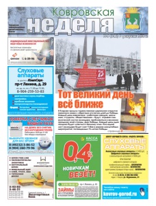 №9 (546) 7 февраля 2020 г. неделя Ковровская 12+ ● ШПОН FINELINE ● ПИЛОМАТЕРИАЛЫ ЭКЗОТИКА ● НАТУРАЛЬНЫЙ ШПОН ● МЕБЕЛЬНЫЙ ЩИТ ● КЛЕЙ, ГРУНТ, ЛАК ● ТЕРРАСНАЯ ДОСКА Северный проезд, д. 1 Лесоторговая база 24202 24631 89190220299 89190220288 89190220277 89190220233 КОМПАНИЯ ВУДСТОК реклама 8 (49232) 3-86-52 8 (904) 260-79-96 ПОВЕРКА СЧЕТЧИКОВ ВОДЫ И ГАЗА ИП Петрова Ю.Г. Аттестат аккредитации № RA.RU.320031 от 28.04.2017 В случае непригодности счетчика оплата за поверку не взимается ВЫБЕРИТЕ УДОБНОЕ ДЛЯ ВАС ВРЕМЯ Е реклама НА ДОМУ, БЕЗ СНЯТИЯ, БЕЗ НАРУШЕНИЯ ПЛОМБ Работаем с 8.00 до 21.00 без обеда и выходных Читайте нашу газету на сайте kovrov-gorod.ru реклама http://kovrov-gorod.ru/newspaper.html Городская информационноаналитическая газета ðåêëàìà Çà¸ì íà óñëîâèÿõ «Íîâûé çà¸ìùèê» ïðåäîñòàâëÿåòñÿ ãðàæäàíàì ÐÔ â âîçðàñòå îò 18 ëåò ïðè ïåðâîì îáðàùåíèè â îðãàíèçàöèþ. Çà¸ì ïðåäîñòàâëÿåòñÿ íàëè÷íûìè äåíåæíûìè ñðåäñòâàìè íà ñðîê 32 äíÿ, ðàçìåð çàéìà ñîñòàâëÿåò îò 1 òûñ. ðóá. äî 10 òûñ. ðóá. Ïðîöåíòíàÿ ñòàâêà ñ 1 ïî 10 äåíü ïîëüçîâàíèÿ çàéìîì ñîñòàâëÿåò 0,4% â äåíü (146% äëÿ íåâèñîêîñíîãî èëè 146,4% ãîäîâûõ äëÿ âèñîêîñíîãî ãîäà), ñ 11 äíÿ ïîëüçîâàíèÿ çàéìîì ïðîöåíòíàÿ ñòàâêà ñîñòàâëÿåò 1% â äåíü (365% äëÿ íåâèñîêîñíîãî èëè 366% ãîäîâûõ äëÿ âèñîêîñíîãî ãîäà); äëÿ ïåíñèîíåðîâ ïî ñòàðîñòè è âûñëóãå ëåò 0,7% â äåíü (255,5% äëÿ íåâèñîêîñíîãî èëè 256,2% ãîäîâûõ äëÿ âèñîêîñíîãî ãîäà). Çàéìû ïðåäîñòàâëÿþòñÿ ÎÎÎ ÌÊÊ "Ê Ïÿòûé Ýëåìåíò Äåíüãè" ÎÃÐÍ 1154025001316 (çàðåãèñòðèðîâàíî â ðååñòðå ÌÔÎ 651503029006503 îò 25 ìàÿ 2015 ã., ñàéò www.5element-mfo.ru). реклама в ЦЕНТРЕ «КомпСлух» пр-т Ленина, д. 29 вт, ср, чт, пт с 11.00 до 15.00, 8-904-259-53-83 ÈÌÅÞÒÑß ÏÐÎÒÈÂÎÏÎÊÀÇÀÍÈß. ÏÐÎÊÎÍÑÓËÜÒÈÐÓÉÒÅÑÜ ÑÎ ÑÏÅÖÈÀËÈÑÒÎÌ P диагностика слуха,подбор, настройка P пробное ношение P микроаппараты (невидимки) Продажа: P батарейки P ушные вкладыши P тонкие трубочки P фильтры Слуховые аппараты ðåêëàìà Àíàëîãîâûå ñëóõîâûå àïïàðàòû îò 5400 ðóá. Öèôðîâûå ñëóõîâûå àïïàðàòû ñ êîìïüþòåðíîé íàñòðîéêîé îò 9000 ðóá. Î ÏÐÎÒÈÂÎÏÎÊÀÇÀÍÈßÕ ÏÐÎÊÎÍÑÓËÜÒÈÐÓÉÒÅÑÜ ÑÎ ÑÏÅÖÈÀËÈÑÒÎÌ ÖÅÍÒÐ ÕÎÐÎØÅÃÎ ÑËÓÕÀ «ÐÀÄÓÃÀ ÇÂÓÊλ ÑËÓÕÎÂÛÅ ÀÏÏÀÐÀÒÛ Âîçìîæåí âûåçä íà äîì. Êîíñóëüòàöèÿ ñî ñïåöèàëèñòîì ïî òåë. 6-46-52, 8-906-562-2992 Àäðåñ: ã. Êîâðîâ, óë. Ôóðìàíîâà, 31 ÏÐÈ ÏÎÊÓÏÊÅ öèôðîâîãî ñëóõîâîãî àïïàðàòà: ïðîôåññèîíàëüíûé ïîäáîð – ÁÅÑÏËÀÒÍÎ êîìïüþòåðíàÿ íàñòðîéêà – ÁÅÑÏËÀÒÍÎ àóäèîãðàììà (ïðîâåðêà ïîòåðè ñëóõà) – ÁÅÑÏËÀÒÍÎ ðåêëàìà В Коврове прошла торжественная церемония открытия памятного знака с обратным отсчетом дней до Победы. Каждый день ковровчане – работники заводов, школьники, студенты, общественники – будут, отрывая символический листок календаря, приближаться к великому празднику всей страны, Дню Победы. Каждый день одна гвоздика будет ложиться к Вечному огню. Последний лист календаря будет снят 9 Мая в рамках масштабных мероприятий, посвященных 75-летию Победы. Тот великий день всё ближе Фото А. Соколова страница 3