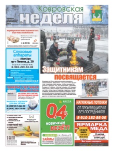 №15 (552) 28 февраля 2020 г. Фото И. Волкова №15 (552 неделя Ковровская 12+ ● ШПОН FINELINE ● ПИЛОМАТЕРИАЛЫ ЭКЗОТИКА ● НАТУРАЛЬНЫЙ ШПОН ● МЕБЕЛЬНЫЙ ЩИТ ● КЛЕЙ, ГРУНТ, ЛАК ● ТЕРРАСНАЯ ДОСКА Северный проезд, д. 1 Лесоторговая база 24202 24631 89190220299 89190220288 89190220277 89190220233 КОМПАНИЯ ВУДСТОК реклама 8 (49232) 3-86-52 8 (904) 260-79-96 ПОВЕРКА СЧЕТЧИКОВ ВОДЫ И ГАЗА ИП Петрова Ю.Г. Аттестат аккредитации № RA.RU.320031 от 28.04.2017 В случае непригодности счетчика оплата за поверку не взимается ВЫБЕРИТЕ УДОБНОЕ ДЛЯ ВАС ВРЕМЯ Е реклама НА ДОМУ, БЕЗ СНЯТИЯ, БЕЗ НАРУШЕНИЯ ПЛОМБ Работаем с 8.00 до 21.00 без обеда и выходных Городская информационноаналитическая газета ðåêëàìà Çà¸ì íà óñëîâèÿõ «Íîâûé çà¸ìùèê» ïðåäîñòàâëÿåòñÿ ãðàæäàíàì ÐÔ â âîçðàñòå îò 18 ëåò ïðè ïåðâîì îáðàùåíèè â îðãàíèçàöèþ. Çà¸ì ïðåäîñòàâëÿåòñÿ íàëè÷íûìè äåíåæíûìè ñðåäñòâàìè íà ñðîê 32 äíÿ, ðàçìåð çàéìà ñîñòàâëÿåò îò 1 òûñ. ðóá. äî 10 òûñ. ðóá. Ïðîöåíòíàÿ ñòàâêà ñ 1 ïî 10 äåíü ïîëüçîâàíèÿ çàéìîì ñîñòàâëÿåò 0,4% â äåíü (146% äëÿ íåâèñîêîñíîãî èëè 146,4% ãîäîâûõ äëÿ âèñîêîñíîãî ãîäà), ñ 11 äíÿ ïîëüçîâàíèÿ çàéìîì ïðîöåíòíàÿ ñòàâêà ñîñòàâëÿåò 1% â äåíü (365% äëÿ íåâèñîêîñíîãî èëè 366% ãîäîâûõ äëÿ âèñîêîñíîãî ãîäà); äëÿ ïåíñèîíåðîâ ïî ñòàðîñòè è âûñëóãå ëåò 0,7% â äåíü (255,5% äëÿ íåâèñîêîñíîãî èëè 256,2% ãîäîâûõ äëÿ âèñîêîñíîãî ãîäà). Çàéìû ïðåäîñòàâëÿþòñÿ ÎÎÎ ÌÊÊ "Ê Ïÿòûé Ýëåìåíò Äåíüãè" ÎÃÐÍ 1154025001316 (çàðåãèñòðèðîâàíî â ðååñòðå ÌÔÎ 651503029006503 îò 25 ìàÿ 2015 ã., ñàéò www.5element-mfo.ru). ОТ ПРОИЗВОДИТЕЛЯ БЕЗ ПОСРЕДНИКОВ РЕКЛАМА 8-910-182-86-06 НАТЯЖНЫЕ ПОТОЛКИ в ЦЕНТРЕ «КомпСлух» пр-т Ленина, д. 29 "2 ,“! ,ć2,C2 “ 11.00 ą% 15.00, 8-904-259-53-83 ÈÌÅÞÒÑß ÏÐÎÒÈÂÎÏÎÊÀÇÀÍÈß. ÏÐÎÊÎÍÑÓËÜÒÈÐÓÉÒÅÑÜ ÑÎ ÑÏÅÖÈÀËÈÑÒÎÌ P ą,=Ą…%“2,*= “ã3.=,C%ąK%! , …=“2!%L*= P C!%K…%Ë …%ĈË…,Ë P ä,*!%=CC=!=2/ (…Ë",ą,ä*,) Продажа: P K=2=!ËL*, P 3Ĉ…/Ë "*ã=ą/Ĉ, P 2%…*,Ë 2!3K%ć*, P -,ãĉ2!/ Дополнительная информация на стр. 28 Слуховые аппараты ðåêëàìà Издавна на Руси мужчин-воинов называли защитниками. Защитник – тот, кто стоит за щитом, сохраняя свою жизнь, чтобы дальше бороться с врагом, тот, кто защищает, укрывает близких от гибели, спасает родину, кто помнит свой долг и честь имеет. День защитника Отечества в этом году в Коврове отметили торжественно: митингом на площади Победы, исторической реконструкцией в парке Экскаваторостроителей, новой выставкой и множеством других интересных мероприятий. Защитникам посвящается страницы 3, 14