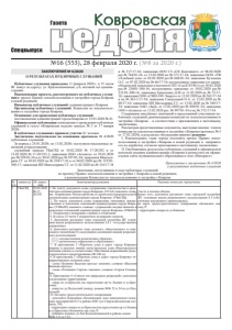 №16 (553), 28 февраля 2020 г. (№8 за 2020 г.) ǺDzDZDzǸȌ ǸȜȐȞȜȐȟȘȎȭ Спецвыпуск Газета ЗАКЛЮЧЕНИЕ № 4/2020 О РЕЗУЛЬТАТАХ ПУБЛИЧНЫХ СЛУШАНИЙ Публичные слушания проведены 11 февраля 2020 г. в 15 часов 00 минут по адресу: ул. Краснознаменная, д.6, актовый зал администрации. Наименование проекта, рассмотренного на публичных слушаниях: проект Правил землепользования и застройки города Коврова в новой редакции Инициатор публичных слушаний: администрация г.Коврова Организатор публичных слушаний: Комиссия по землепользованию и застройке города Коврова. Основание для проведения публичных слушаний: постановление администрации города Коврова от 15.01.2020 № 41. Официальная публикация оповещения о проведении публичных слушаний в газете «Ковровская неделя» выпуск № 3 от 17 января 2020г. В публичных слушаниях приняли участие 61 человек Заключение подготовлено на основании протокола № 4/2020 публичных слушаний. За период с 24.01.2020г. по 13.02.2020г. поступили письменные замечания и предложения: служебная записка УБиСРД от 10.02.2020 № 17-20/292 и от 13.02.2020 № 17-20/333-1; заявления ООО «Атланта» от 29.01.2020 рег.№ 559/01-34 и от 30.01.2020 рег.№ 597/01-34; заявления Мангасаряна Г.Г от 03.02.2020 вх.№ 254/17-16 и от 04.02.2020 рег.№ 153/01300-17; заявления ИП Мангасаряна Г.Г. от 11.02.2020 вх.№ 316/17-34 и № 317/17-34; заявления ООО СЗ «СК Континент» от 06.02.2020 рег.№ 764/01-34, от 13.02.2020 вх.№ 371/17-34; заявление ООО «ТФ «Хлебный дом» от 03.02.2020 рег.№ 668/01-34; заявление Кузьмина О.С. от 07.02.2020 вх.№ 66/17-16; коллективное заявление (от правообладателей земельных участков в СНТ «Сад КЭЗ №1») от 10.02.2020 рег.№ 230/01-300-16; коллективное заявление от 10.02.2020 рег.№ 231/01-300-16; заявление Ермоленко Д.М от 11.02.2020 вх.№ 72/1716; заявления ООО «СМП-245-Энерго» от 12.02.2020 вх.№ 363/17-34 и вх.№ 363-1/17-34; заявление Сандаловой О.А. от 12.02.2020 вх.№ 80/17-16; заявление ИП Магасаряна Г.Г. от 13.02.2020 вх.№ 369/1734; заявление ОАО «ЗиД» от 13.02.2020 рег.№ 940/01-34; заявление ООО «Атланта» от 13.02.2020 рег. № 997/01-34 и вх.№ 372/17-34. Содержание внесённых замечаний и предложений участников публичных слушаний, рекомендации комиссии по землепользованию и застройке г.Коврова – в соответствии с приложением к настоящему заключению. Рассмотрев представленные документы, выслушав мнение членов комиссии по землепользованию и застройке г.Коврова (протокол № 5 от 17.02.2020), в результате обсуждения принято решение: I. Рекомендовать главе города отклонить проект Правил землепользования и застройки г.Коврова в новой редакции и направить его на доработку согласно приложения к настоящему заключению. II. Опубликовать результаты публичных слушаний в официальном печатном издании администрации г.Коврова и разместить на официальном сайте муниципального образования в сети «Интернет». Приложение к заключению № 4/2020 о результатах публичных слушаний Замечания, поступившие в ходе публичных слушаний по проекту Правил землепользования и застройки г. Коврова в новой редакции, и рекомендации Комиссии по землепользованию и застройке г.Коврова № п/п заявитель № заявления Замечания/предложения Решение комиссии /примечание 1. УБиСРД 10.02.2020 № 1720/292 1. По тексту документа слова «управление строительства и архитектуры администрации города Коврова» (УСиА) заменить словами: «управление благоустройства и строительно-разрешительной документации администрации города Коврова» (УБиСРД). 2. По тексту документа слова «управление экономики, имущественных и земельных отношений администр