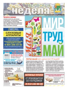 свежие новости, рассказы о земляках, актуальные темы, культурная и спортивная жизнь, официальная информация, афиша, объявления, сканворд и немного юмора. Читайте в номере: №32 (569) 30 апреля 2020 г. неделя Ковровская 12+ ● ШПОН FINELINE ● ПИЛОМАТЕРИАЛЫ ЭКЗОТИКА ● НАТУРАЛЬНЫЙ ШПОН ● МЕБЕЛЬНЫЙ ЩИТ ● КЛЕЙ, ГРУНТ, ЛАК ● ТЕРРАСНАЯ ДОСКА Северный проезд, д. 1 Лесоторговая база 24202 24631 89190220299 89190220288 89190220277 89190220233 КОМПАНИЯ ВУДСТОК реклама 8 (49232) 3-86-52 8 (904) 260-79-96 ПОВЕРКА СЧЕТЧИКОВ ВОДЫ И ГАЗА ИП Петрова Ю.Г. Аттестат аккредитации № RA.RU.320031 от 28.04.2017 В случае непригодности счетчика оплата за поверку не взимается ВЫБЕРИТЕ УДОБНОЕ ДЛЯ ВАС ВРЕМЯ Е реклама НА ДОМУ, БЕЗ СНЯТИЯ, БЕЗ НАРУШЕНИЯ ПЛОМБ Работаем с 8.00 до 21.00 без обеда и выходных Городская информационноаналитическая газета ОТ ПРОИЗВОДИТЕЛЯ БЕЗ ПОСРЕДНИКОВ РЕКЛАМА 8-910-182-86-06 НАТЯЖНЫЕ ПОТОЛКИ ÈÌÅÞÒÑß ÏÐÎÒÈÂÎÏÎÊÀÇÀÍÈß. ÏÐÎÊÎÍÑÓËÜÒÈÐÓÉÒÅÑÜ ÑÎ ÑÏÅÖÈÀËÈÑÒÎÌ СЛУХОВЫЕ АППАРАТЫ реклама КомпСлух» возвращает слух Офис на Ленина, 29 закрыт до истечения срока действия режима самоизоляции СЛУХОПРОТЕЗИРОВАНИЕ С ВЫЕЗДОМ НА ДОМ: 8-904-259-53-83 e-mail: KompSluh33@yandex.ru мир труд май ПЕРВОМАЙ БЕЗ ДЕМОНСТРАЦИЙ Ограничительные меры в связи с пандемией нового коронавируса неизбежно скажутся и на любимых в нашей стране майских праздниках. Массовых мероприятий – шествий, демонстраций, маёвок – не будет. Даже проф союзы, всегда организующие первомайские акции, на сей раз призывают трудящихся проявить свою солидарность виртуально, в интернете. По сути праздничные каникулы станут продолжением режима самоизоляции. Должны стать, если наши граждане проявят сознательность и ответственность, не устремятся толпами к шашлычным мангалам и прочему групповому веселью – ведь оно неизбежно аукнется всплеском болезни. Давайте всё же беречь себя и других, праздновать умеренно, воздерживаться от лишнего общения. Что ж поделать, вот такой у нас нынче Первомай...