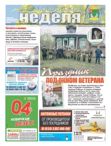Çà¸ì íà óñëîâèÿõ «Íîâûé çà¸ìùèê» ïðåäîñòàâëÿåòñÿ ãðàæäàíàì ÐÔ â âîçðàñòå îò 18 ëåò ïðè ïåðâîì îáðàùåíèè â îðãàíèçàöèþ. Çà¸ì ïðåäîñòàâëÿåòñÿ íàëè÷íûìè äåíåæíûìè ñðåäñòâàìè íà ñðîê 32 äíÿ, ðàçìåð çàéìà ñîñòàâëÿåò îò 1 òûñ. ðóá. äî 10 òûñ. ðóá. Ïðîöåíòíàÿ ñòàâêà ñ 1 ïî 10 äåíü ïîëüçîâàíèÿ çàéìîì ñîñòàâëÿåò 0,4% â äåíü (146% äëÿ íåâèñîêîñíîãî èëè 146,4% ãîäîâûõ äëÿ âèñîêîñíîãî ãîäà), ñ 11 äíÿ ïîëüçîâàíèÿ çàéìîì ïðîöåíòíàÿ ñòàâêà ñîñòàâëÿåò 1% â äåíü (365% äëÿ íåâèñîêîñíîãî èëè 366% ãîäîâûõ äëÿ âèñîêîñíîãî ãîäà); äëÿ ïåíñèîíåðîâ ïî ñòàðîñòè è âûñëóãå ëåò 0,7% â äåíü (255,5% äëÿ íåâèñîêîñíîãî èëè 256,2% ãîäîâûõ äëÿ âèñîêîñíîãî ãîäà). Çàéìû ïðåäîñòàâëÿþòñÿ ÎÎÎ ÌÊÊ "Ê Ïÿòûé Ýëåìåíò Äåíüãè" ÎÃÐÍ 1154025001316 (çàðåãèñòðèðîâàíî â ðååñòðå ÌÔÎ 651503029006503 îò 25 ìàÿ 2015 ã., ñàéò www.5element-mfo.ru). реклама свежие новости, рассказы о земляках, актуальные темы, культурная и спортивная жизнь, официальная информация, афиша, объявления, сканворд и немного юмора. Читайте в номере: №34 (571) 8 мая 2020 г. неделя Ковровская 12+ ● ШПОН FINELINE ● ПИЛОМАТЕРИАЛЫ ЭКЗОТИКА ● НАТУРАЛЬНЫЙ ШПОН ● МЕБЕЛЬНЫЙ ЩИТ ● КЛЕЙ, ГРУНТ, ЛАК ● ТЕРРАСНАЯ ДОСКА Северный проезд, д. 1 Лесоторговая база 24202 24631 89190220299 89190220288 89190220277 89190220233 КОМПАНИЯ ВУДСТОК реклама 8 (49232) 3-86-52 8 (904) 260-79-96 ПОВЕРКА СЧЕТЧИКОВ ВОДЫ И ГАЗА ИП Петрова Ю.Г. Аттестат аккредитации № RA.RU.320031 от 28.04.2017 В случае непригодности счетчика оплата за поверку не взимается ВЫБЕРИТЕ УДОБНОЕ ДЛЯ ВАС ВРЕМЯ Е реклама НА ДОМУ, БЕЗ СНЯТИЯ, БЕЗ НАРУШЕНИЯ ПЛОМБ Работаем с 8.00 до 21.00 без обеда и выходных Городская информационноаналитическая газета ОТ ПРОИЗВОДИТЕЛЯ БЕЗ ПОСРЕДНИКОВ РЕКЛАМА 8-910-182-86-06 НАТЯЖНЫЕ ПОТОЛКИ Фото А. Соколова страница 3 реклама Читайте нашу газету на сайте kovrov-gorod.ru реклама Необычно, но очень трогательно и красиво в Коврове поздравили с 9 Мая творцов Победы. К домам четверых ветеранов пришли гости. Было всё: небольшой концерт, добрые слова, цветы, подарки, Знамя Победы. Пусть не состоятся в этот раз парад и салют – праздник организовали с доставкой на дом. Ведь наши уважение, благодарность и любовь к поколению победителей остаются неизменными. ПОД ОКНОМ ВЕТЕРАНА Ïðàçäíèê