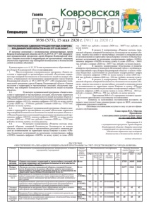 №36 (573), 15 мая 2020 г. (№17 за 2020 г.) ǺDzDZDzǸȌ ǸȜȐȞȜȐȟȘȎȭ Спецвыпуск Газета ПОСТАНОВЛЕНИЕ АДМИНИСТРАЦИИ ГОРОДА КОВРОВА ВЛАДИМИРСКОЙ ОБЛАСТИ № 835 ОТ 12.05.2020 Г. О внесении изменений в постановление администрации города Коврова Владимирской области от 05.11.2019 № 2577 «Об утверждении муниципальной программы города Коврова Владимирской области «Защита населения и территорий от чрезвычайных ситуаций, обеспечение первичных мер пожарной безопасности и безопасности людей на водных объектах» Руководствуясь ст.ст. 6, 32, 35 Устава муниципального образования город Ковров Владимирской области постановляю: 1. Внести изменения в муниципальную программу «Защита населения и территорий от чрезвычайных ситуаций, обеспечение первичных мер пожарной безопасности и безопасности людей на водных объектах», утвержденную постановлением администрации города Коврова Владимирской области от 05.11.2019 № 2577 «Об утверждении муниципальной программы города Коврова Владимирской области «Защита населения и территорий от чрезвычайных ситуаций, обеспечение первичных мер пожарной безопасности и безопасности людей на водных объектах» 1.1. В паспорте муниципальной программы «Защита населения и территорий от чрезвычайных ситуаций, обеспечение первичных мер пожарной безопасности и безопасности людей на водных объектах « «Объемы бюджетных ассигнований на реализацию муниципальной программы» цифры «105315» заменить цифрами «105745» по всему пункту и слова «2020 год – 37105тыс. рублей;» словами «2020 год - 37535 тыс. рублей;» по всему пункту; 1.2. В разделе 8 муниципальной программы «Защита населения и территорий от чрезвычайных ситуаций, обеспечение первичных мер пожарной безопасности и безопасности людей на водных объектах « «Объемы бюджетных ассигнований на реализацию муниципальной программы» цифры «105315» заменить цифрами «105745» по всему пункту и слова «2020 год - 37105 тыс. рублей;» словами «2020 год - 37535 тыс. рублей;» по всему пункту; по всему разделу; 1.3. В паспорте подпрограммы «Развитие системы гражданской обороны, пожарной безопасности, безопасности на водных объектах, защиты населения от чрезвычайных ситуаций и снижения рисков их возникновения на территории города Коврова» в пункте «Объемы бюджетных ассигнований на реализацию подпрограммы» цифры «103983» заменить цифрами «104299» по всему пункту и слова «2020 год – 36661 тыс. рублей;» словами «2020 год - 36977 тыс. рублей;» по всему пункту. 1.4. В разделе 8 подпрограммы «Развитие системы гражданской обороны, пожарной безопасности, безопасности на водных объектах, защиты населения от чрезвычайных ситуаций и снижения рисков их возникновения на территории города Коврова» в пункте «Объемы бюджетных ассигнований на реализацию подпрограммы» цифры «103983» заменить цифрами «104299» по всему пункту и слова «2020 год – 36661 тыс. рублей;» словами «2020 год - 36977 тыс. рублей;» по всему разделу. 1.5. В паспорте подпрограммы «Построение и развитие аппаратно-программного комплекса «Безопасный город» в муниципальном образовании город Ковров Владимирской области» в пункте «Объемы бюджетных ассигнований на реализацию подпрограммы» цифры «1332» заменить цифрами «1446» по всему пункту и слова «2020 год – 444 тыс. рублей;» словами «2020 год - 558 тыс. рублей;» по всему пункту. 1.6. В разделе 8 подпрограммы «Развитие системы гражданской обороны, пожарной безопасности, безопасности на водны
