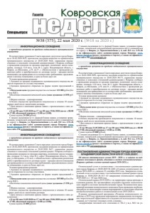 №38 (575), 22 мая 2020 г. (№18 за 2020 г.) ǺDzDZDzǸȌ ǸȜȐȞȜȐȟȘȎȭ Спецвыпуск Газета ИНФОРМАЦИОННОЕ СООБЩЕНИЕ о проведении аукциона по продаже недвижимого муниципального имущества В соответствии с решением Совета народных депутатов города Коврова от 26.02.2020 №35, протоколом заседания комиссии по приватизации муниципального имущества от 20.05.2020 №26, управление имущественных и земельных отношений администрации г. Коврова сообщает о проведении аукциона по продаже квартиры, назначение: жилое помещение, площадь 13,0 кв.м, этаж № 2, адрес: Владимирская область, г. Ковров, ул.Абельмана, д.19, кв.17, с обязательством о проведении ремонтных работ в приобретаемом по договору купли – продажи жилом помещении для приведения его в соответствие требованиям, предъявляемым к жилому помещению, в срок не более двух лет. Условия проведения аукциона: 1.Аукцион по продаже недвижимого муниципального имущества является открытым по составу участников. 2.Аукцион проводится открытым по форме подачи предложений о цене. 3.Начальная цена продажи имущества составляет 121 000 рубля (без учета НДС). 4.Величина повышения начальной цены («шаг аукциона») 6 050 рублей. 5.Форма платежа – единовременная. 6.Оплата имущества производится покупателем в течение 10 календарных дней после заключения договора. 7.Дата начала и окончания приема заявок с прилагаемыми к ним документами – с 8 час 00 мин 21.05.2020 по 17 час 00 мин 19.06.2020 (пн-пт с 08:00 до 17:00, обеденный перерыв с 12:00 до 13:00). Сумма задатка 24 200 рублей. С иными сведениями (в т.ч. формой бланка заявки, условиями приватизации, технической документацией) претенденты могут ознакомиться по адресу: г. Ковров, ул. Краснознаменная д. 6, каб. 412 тел. 3-51-26 и на официальном сайте администрации города Коврова: www. kovrov-gorod.ru (раздел «аукционы и торги»), а также на официальном сайте РФ www.torgi.gov.ru. ИНФОРМАЦИОННОЕ СООБЩЕНИЕ о проведении аукциона по продаже недвижимого муниципального имущества В соответствии с решением Совета народных депутатов города Коврова от 26.02.2020 №34, протоколом заседания комиссии по приватизации муниципального имущества от 20.05.2020 №27, управление имущественных и земельных отношений администрации г. Коврова сообщает о проведении аукциона по продаже квартиры, назначение: жилое помещение, площадь 11,3 кв.м, этаж № 2, адрес: Владимирская область, г. Ковров, ул.Абельмана, д.19, кв.6, с обязательством о проведении ремонтных работ в приобретаемом по договору купли – продажи жилом помещении для приведения его в соответствие требованиям, предъявляемым к жилому помещению, в срок не более двух лет. Условия проведения аукциона: 1.Аукцион по продаже недвижимого муниципального имущества является открытым по составу участников. 2.Аукцион проводится открытым по форме подачи предложений о цене. 3.Начальная цена продажи имущества составляет 105 000 рубля (без учета НДС). 4.Величина повышения начальной цены («шаг аукциона») 5 250 рублей. 5.Форма платежа – единовременная. 6.Оплата имущества производится покупателем в течение 10 календарных дней после заключения договора. 7.Дата начала и окончания приема заявок с прилагаемыми к ним документами – с 8 час 00 мин 21.05.2020 по 17 час 00 мин 19.06.2020 (пн-пт с 08:00 до 17:00, обеденный перерыв с 12:00 до 13:00). Сумма задатка 21 000 рублей. С иными сведениями (в т.ч. формой бланка заявки, условиями приватизации, технической документацией) претенденты могут ознакомиться по адре