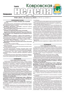 №66 (603), 28 августа 2020 г. (№32 за 2020 г.) ǺDzDZDzǸȌ ǸȜȐȞȜȐȟȘȎȭ Спецвыпуск Газета ЗАКЛЮЧЕНИЕ № 25/2020 О РЕЗУЛЬТАТАХ ОБЩЕСТВЕННЫХ ОБСУЖДЕНИЙ 18.08.2020 Наименование проекта, рассмотренного на общественных обсуждениях: корректировка проекта планировки и проекта межевания территории микрорайона «Маршала Устинова» Инициатор общественных обсуждений: генеральный директор ООО «СЗ Доброград» В.В. Ахапкин Организатор общественных обсуждений: Комиссия по землепользованию и застройке города Коврова. Основание для проведения общественных обсуждений: постановление администрации города Коврова от 23.07.2020 № 1273. Официальная публикация оповещения о проведении общественных обсуждений в газете «Ковровская неделя» спецвыпуск № 56 от 24 июля 2020г. Информационные материалы к проекту были размещены: на официальном сайте администрации г.Коврова kovrov-gorod.ru в разделе «градостроительная деятельность», подраздел «проекты, рассматриваемые на публичных слушаниях» с 31 июля 2020г. по 14 августа 2020г. Экспозиция проекта проводилась: с 10 августа 2020 по 14 августа 2020 по адресу: г. Ковров, ул. Фурманова, д. 37, каб. 10 Предложения и замечания участников общественных обсуждений принимались: с 31 июля 2020г. по 14 августа 2020г. Заключение подготовлено на основании протокола № 25/2020 общественных обсуждений. В период проведения общественных обсуждений письменные замечания и предложения не поступили. Рассмотрев представленные документы, выслушав мнение членов комиссии по землепользованию и застройке г.Коврова (выписка из протокола № 22 от 18.08.2020), в результате обсуждения принято решение: I. Рекомендовать Главе города утвердить корректировку проекта планировки и проекта межевания территории микрорайона «Маршала Устинова». II. Опубликовать результаты общественных обсуждений в официальном печатном издании администрации г.Коврова и разместить на официальном сайте муниципального образования в сети «Интернет». ОПОВЕЩЕНИЕ о начале общественных обсуждений Администрация города информирует население г. Коврова о проведении общественных обсуждений по проекту решения о предоставлении разрешения на отклонение от предельных параметров разрешенного строительства, реконструкции объекта капитального строительства на земельном участке, расположенном в зоне застройки индивидуальными жилыми домами Ж-3 по адресу: Владимирская область, МО городской округ г. Ковров, г.Ковров, ул.Бурматова, д.124 (кадастровый № 33:20:014712:5). Дата начала общественных обсуждений: 28 августа 2020г. Дата окончания общественных обсуждений: 25 сентября 2020г. Информационные материалы по проекту (проектная документация на индивидуальный жилой дом, разработанная ООО «АльянсПроект») будут размещены на официальном сайте администрации г.Коврова kovrovgorod.ru в разделе «градостроительная деятельность», подраздел «проекты, рассматриваемые на публичных слушаниях» с 04 сентября 2020г. по 18 сентября 2020г. Экспозиция проекта будет проводиться по адресу: г.Ковров, ул. Фурманова, д.37, каб. 10, с 14 сентября 2020г. по 18 сентября 2020г. Время работы экспозиции: в рабочие дни с 15:00 до 17:00, проводятся консультации по теме общественных обсуждений. В период с 4 сентября 2020г. по 18 сентября 2020г. участники общественных обсуждений, прошедшие идентификацию, имеют право вносить предложения и замечания, касающиеся проектов, подлежащих рассмотрению: - посредством официаль