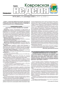 №70 (607), 11 сентября 2020 г. (№37 за 2020 г.) ǺDzDZDzǸȌ ǸȜȐȞȜȐȟȘȎȭ Спецвыпуск Газета В связи с технической ошибкой при подготовке заключения № 26/2020 о результатах общественных обсуждений, опубликованного в спецвыпуске № 68 газеты «Ковровская неделя» от 04.09.2020, названное заключение читать в следующей редакции: ЗАКЛЮЧЕНИЕ № 26/2020 О РЕЗУЛЬТАТАХ ОБЩЕСТВЕННЫХ ОБСУЖДЕНИЙ 31.08.2020 Наименование проекта, рассмотренного на общественных обсуждениях: Проект решения о предоставлении разрешения на условно разрешенный вид использования «для индивидуального жилищного строительства» и на отклонение от предельных параметров разрешенного строительства, реконструкции объекта капитального строительства на земельном участке, расположенном в перспективной зоне делового, общественного и социального назначения О-Р по адресу: Владимирская область, МО городской округ г. Ковров, г.Ковров, ул.Чкалова, д.57 (кадастровый № 33:20:014906:2). Инициатор общественных обсуждений: Лезова В.А. Организатор общественных обсуждений: Комиссия по землепользованию и застройке города Коврова. Основание для проведения общественных обсуждений: постановление администрации города Коврова от 06.08.2020 № 1343. Официальная публикация оповещения о проведении общественных обсуждений в газете «Ковровская неделя» спецвыпуск № 60 от 07 августа 2020г. Информационные материалы к проекту были размещены: на официальном сайте администрации г.Коврова kovrov-gorod.ru в разделе «градостроительная деятельность», подраздел «проекты, рассматриваемые на публичных слушаниях» с 14 августа 2020г. по 28 августа 2020г. Экспозиция проекта проводилась: с 24 августа 2020 по 28 августа 2020 по адресу: г. Ковров, ул. Фурманова, д. 37, каб. 10 Предложения и замечания участников общественных обсуждений принимались: с 14 августа 2020г. по 28 августа 2020г. Заключение подготовлено на основании протокола № 26/2020 общественных обсуждений. В период проведения общественных обсуждений, при посещении экспозиции проекта (25.08.2020), поступили замечания и предложения граждан, являющихся участниками общественных обсуждений: 1.Замечание Челедковой Л.И., проживающей по адресу: ул. Чкалова, д.55 – строительство ведется в полном объеме без разрешения, письмо и фото прилагается, со строительством дома по данному проекту не согласна. В адрес администрации поступило заявление вх. №1886/01-30016 от 26.08.2020 от Челедковой Л.И. 2. Замечание Кузициной Е.Н., проживающей по адресу: ул.Ватутина, д.4, - со строительством 3-х этажного дома не согласна. Замечания и предложения иных участников общественных обсуждений отсутствуют. Содержание внесенных предложений и замечаний: Собственником земельного участка д.№55 по ул. Чкалова выражено несогласие в части увеличения коэффициента застройки до 27% от допустимого 20%, расстояния от границы участка 3,5 метра – ранее было 5 метров, что приводит к снижению светового потока, нарушению норм инсоляции, а также проведение строительных работ на земельном участке без получения соответствующего решения. К заявлению приложены фотографии о проведении строительных работ на участке. Челедкова Л.И. просит отказать в предоставлении разрешения на условно разрешенный вид использования участка. Рассмотрев представленные документы, выслушав мнение членов комиссии по землепользованию и застройке г.Коврова (протокол № 24 от 31.08.2020), в результате обсуждения принято ре