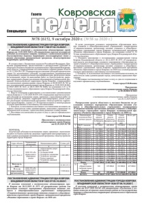 №78 (615), 9 октября 2020 г. (№38 за 2020 г.) ǺDzDZDzǸȌ ǸȜȐȞȜȐȟȘȎȭ Спецвыпуск Газета ПОСТАНОВЛЕНИЕ АДМИНИСТРАЦИИ ГОРОДА КОВРОВА ВЛАДИМИРСКОЙ ОБЛАСТИ № 1788 ОТ 02.10.2020 Г. О внесении изменений в постановление администрации города Коврова от 12.05.2020 №834 «Об утверждении перечня получателей субсидий на возмещение затрат, связанных с выполнением работ по благоустройству дворовых территорий многоквартирных домов в рамках реализации муниципальной программы «Благоустройство территории города Коврова» В соответствии с Бюджетным кодексом Российской Федерации, Правилами формирования, предоставления и распределения субсидий из областного бюджета бюджетам муниципальных образований Владимирской области, утвержденными постановлением администрации области от 19.12.2014 № 1287, Порядком предоставления субсидий юридическим лицам (за исключением субсидий государственным (муниципальным учреждениям), индивидуальным предпринимателям, физическим лицам на возмещение затрат на выполнение работ по благоустройству дворовых территорий в рамках реализации мероприятий муниципальной программы «Благоустройство территории города Коврова», утвержденным постановлением администрации города Коврова от 08.04.2019 № 782 (в ред. постановлений администрации города Коврова от 19.04.2019 № 863, от 09.07.2019 № 1612, от 08.11.2019 № 2649), на основании ст.31 и 32 Устава муниципального образования город Ковров Владимирской области постановляю: 1. Внести изменения в приложение к постановлению администрации города Коврова от 12.05.2020 № 834 «Об утверждении перечня получателей субсидий на возмещение затрат, связанных с выполнением работ по благоустройству дворовых территорий многоквартирных домов в рамках реализации муниципальной программы «Благоустройство территории города Коврова», строки 2,17,18 перечня изложить в новой редакции согласно приложению к настоящему постановлению. 2. Контроль за исполнением настоящего постановления возложить на первого заместителя главы администрации, начальника управления по экономической политике, стратегическому развитию и инвестициям. 3. Настоящее постановление вступает в силу со дня его официального опубликования. Глава города Е.В. Фомина Приложение к постановлению администрации г орода Коврова от 02.10.2020 №1788 ПЕРЕЧЕНЬ получателей субсидии на возмещение затрат, связанных с выполнением работ по благоустройству дворовых территорий многоквартирных домов в рамках реализации муниципальной программы «Благоустройство территории города Коврова» N п/п Адрес объекта Управляющая организация Наименование работ Сумма, руб. 1 2 3 4 5 2 ул. С. Лазо, 4 ООО УО «Реформа многоквартирных домов» 1. Асфальтировка дворового проезда 2. Установка МАФ 3. Устройство освещения 4. Устройство тротуара 5. Ремонт парковки 6. Устройство ливневой канализации 1 401 409,7 17 Всего по городу: 32 293 217,3 18 В т.ч. по управляющим организациям: ООО УО «Реформа многоквартирных домов» 5 220 663,6 ПОСТАНОВЛЕНИЕ АДМИНИСТРАЦИИ ГОРОДА КОВРОВА ВЛАДИМИРСКОЙ ОБЛАСТИ № 1823 ОТ 05.10.2020 Г. О внесении изменений в постановление администрации города Коврова от 20.12.2019 № 2975 «О распределении средств для реализации основного мероприятия «Организация питания учащихся в общеобразовательных учреждениях» подпрограммы «Совершенствование организации питания учащихся в общеобразовательных учреждениях города Коврова» муниципальной прог