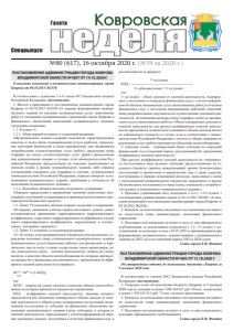 №80 (617), 16 октября 2020 г. (№39 за 2020 г.) ǺDzDZDzǸȌ ǸȜȐȞȜȐȟȘȎȭ Спецвыпуск Газета ПОСТАНОВЛЕНИЕ АДМИНИСТРАЦИИ ГОРОДА КОВРОВА ВЛАДИМИРСКОЙ ОБЛАСТИ №1897 ОТ 14.10.2020 Г. О внесении изменений в постановление администрации города Коврова от 09.10.2015 №2558 В соответствии с пунктами 3 и 4 статьи 69.2 Бюджетного кодекса Российской Федерации, постановляю: 1. Внести в приложение к постановлению администрации города Коврова от 09.10.2015 №2558 «О порядке формирования муниципального задания на оказание муниципальных услуг (выполнение работ) в отношении муниципальных учреждений города Коврова и финансового обеспечения выполнения муниципального задания» следующие изменения: 1.1. В пункте 3: 1.1.1. Абзац первый изложить в следующей редакции: «Муниципальное задание содержит показатели, характеризующие качество и (или) объем муниципальной услуги (работы), определение категорий физических и (или) юридических лиц, являющихся потребителями соответствующих услуг (работ), предельные цены (тарифы) на оплату соответствующих услуг (работ) физическими или юридическими лицами в случаях, если законодательством Российской Федерации предусмотрено их оказание (выполнение) на платной основе в рамках муниципального задания, либо порядок установления указанных цен (тарифов) в случаях, установленных законодательством Российской Федерации, порядок контроля за исполнением муниципального задания, требования к отчетности об исполнении муниципального задания.». 1.1.2. Дополнить абзацем шестым следующего содержания: «Порядок определения и применения значений допустимых (возможных) отклонений устанавливается правовым актом главного распорядителя бюджетных средств.». 1.2. Пункт 19 дополнить абзацем вторым следующего содержания: «В порядке, указанном в абзаце первом настоящего пункта, может устанавливаться применение территориального корректирующего коэффициента, отраслевого корректирующего коэффициента и (или) иного корректирующего коэффициента, определяемых в соответствии с указанным порядком.». 1.3. Пункт 21 изложить в следующей редакции: «21. В случае, если муниципальное бюджетное или автономное учреждение оказывает сверх установленного муниципального задания муниципальные услуги (выполняет работы) для физических и юридических лиц за плату, а также осуществляет иную приносящую доход деятельность (далее – платная деятельность), затраты на уплату налогов, в качестве объекта налогообложения по которым признается имущество учреждения, рассчитываются с применением коэффициента платной деятельности по формуле: №УН = №УН х (1-КПД), КПД где: №УН – затраты на уплату налогов, в качестве объекта налогообложения по которым признается имущество учреждения; КПД – коэффициент платной деятельности, значение которого определяется как отношение планируемого объема доходов от платной деятельности к общей сумме планируемых поступлений, включающей поступления от субсидии на финансовое обеспечение выполнения муниципального задания (далее субсидия), и доходов от платной деятельности, определяемых с учетом информации об объемах указанных доходов, полученных в отчетном финансовом году, и рассчитывается по формуле: V пд (план) КПД = ---------------------------------------------------, V субсидии (план) + V пд (план) где: V пд (план) – объем доходов от платной деятельности, планируемых к получению в очередном финансовом г