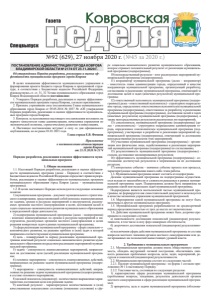 №92 (629), 27 ноября 2020 г. (№45 за 2020 г.) ǺDzDZDzǸȌ ǸȜȐȞȜȐȟȘȎȭ Спецвыпуск Газета ПОСТАНОВЛЕНИЕ АДМИНИСТРАЦИИ ГОРОДА КОВРОВА ВЛАДИМИРСКОЙ ОБЛАСТИ № 2174 ОТ 23.11.2020 Г. Об утверждении Порядка разработки, реализации и оценки эффективности муниципальных программ города Коврова В целях повышения эффективности муниципального управления и формирования проекта бюджета города Коврова в программной структуре, в соответствии с Бюджетным кодексом Российской Федерации, руководствуясь ст. ст. 31, 32 Устава муниципального образования город Ковров Владимирской области постановляю: 1. Утвердить Порядок разработки, реализации и оценки эффективности муниципальных программ города Коврова, согласно приложению. 2. Признать утратившим силу постановление Главы муниципального образования город Ковров от 05.05.2014 № 1037 № «Об утверждении Порядка разработки, реализации и оценки эффективности муниципальных программ города Коврова. 3. Контроль за исполнением настоящего постановления возложить на первого заместителя главы администрации, начальника управления по экономической политике, стратегическому развитию и инвестициям. 4. Настоящее постановление вступает в силу со дня официального опубликования, но не ранее 01.01.2021 года. Глава города Е.В. Фомина Приложение к постановлению администрации города Коврова от 23.11.2020 № 2174 Порядок разработки, реализации и оценки эффективности муниципальных программ 1. Общие положения 1.1. Настоящий Порядок разработки, реализации и оценки эффективности муниципальных программ (далее - Порядок) в соответствии с Бюджетным кодексом Российской Федерации определяет правила разработки, реализации и оценки эффективности муниципальных программ муниципального образования город Ковров (далее - муниципальные программы). 1.2. В целях настоящего Порядка используются следующие основные понятия: 1) муниципальная программа - документ муниципального стратегического планирования, представляющий собой комплекс взаимоувязанных по задачам, срокам и ресурсам мероприятий и инструментов, реализуемых органами местного самоуправления в целях достижения целей и задач социально-экономического развития муниципального образования в определенной сфере деятельности; 2) подпрограмма муниципальной программы (далее - подпрограмма) - комплекс взаимоувязанных по срокам и ресурсам мероприятий и инструментов, реализуемых органами местного самоуправления в целях решения конкретных задач в рамках муниципальной программы; 3) сфера реализации муниципальной программы - сфера социально-экономического развития, на решение проблем и (или) задач в которой направлена соответствующая муниципальная программа; 4) цель - планируемый за период реализации муниципальной программы конечный результат социально-экономического развития муниципального образования посредством реализации мероприятий муниципальной программы; 5) задача - совокупность взаимосвязанных мероприятий, направленных на достижение цели (целей) реализации муниципальной программы; 6) основное мероприятие - совокупность взаимосвязанных действий, направленных на решение задачи муниципальной программы (подпрограммы); 7) мероприятие - совокупность взаимосвязанных действий, направленных на решение задачи муниципальной программы (подпрограммы), в составе основного мероприятия; 8) целевой показатель (ин