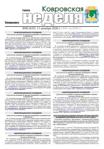 №96 (633), 11 декабря 2020 г. (№47 за 2020 г.) ǺDzDZDzǸȌ ǸȜȐȞȜȐȟȘȎȭ Спецвыпуск Газета ИНФОРМАЦИОННОЕ СООБЩЕНИЕ о результатах аукциона по продаже недвижимого муниципального имущества На основании решения комиссии по приватизации муниципального имущества от 07.12.2020 №145, управление имущественных и земельных отношений администрации г.Коврова сообщает, что аукцион по продаже комнаты, назначение: жилое помещение, площадь 14,3 кв.м, этаж № 3, адрес: Владимирская область, г. Ковров, ул. Абельмана, д.19, ком.40, (информацию о проведении аукциона см. на официальных сайтах РФ: www.torgi.gov.ru, www.kovrov-gorod.ru), назначенный на 09 декабря 2020г., признан несостоявшимся. ИНФОРМАЦИОННОЕ СООБЩЕНИЕ о результатах аукциона по продаже недвижимого муниципального имущества На основании решения комиссии по приватизации муниципального имущества от 07.12.2020 №146, управление имущественных и земельных отношений администрации г.Коврова сообщает, что аукцион по продаже квартиры, назначение: жилое помещение, площадь 13,9 кв.м, этаж № 2, адрес: Владимирская область, г. Ковров, ул. Абельмана, д.19, кв.21, (информацию о проведении аукциона см. на официальных сайтах РФ: www.torgi.gov.ru, www.kovrov-gorod.ru), назначенный на 09 декабря 2020г, признан несостоявшимся. ИНФОРМАЦИОННОЕ СООБЩЕНИЕ о результатах аукциона по продаже недвижимого муниципального имущества На основании решения комиссии по приватизации муниципального имущества от 07.12.2020 №147, управление имущественных и земельных отношений администрации г.Коврова сообщает, что аукцион по продаже квартиры, назначение: жилое помещение, площадь 13,0 кв.м, этаж № 2, адрес: Владимирская область, г. Ковров, ул. Абельмана, д.19, кв.17, (информацию о проведении аукциона см. на официальных сайтах РФ: www.torgi.gov.ru, www.kovrov-gorod.ru), назначенный на 09 декабря 2020г, признан несостоявшимся. ИНФОРМАЦИОННОЕ СООБЩЕНИЕ о результатах аукциона по продаже недвижимого муниципального имущества На основании решения комиссии по приватизации муниципального имущества от 07.12.2020 №148, управление имущественных и земельных отношений администрации г.Коврова сообщает, что аукцион по продаже квартиры, назначение: жилое помещение, площадь 10,4 кв.м, этаж № 3, адрес: Владимирская область, г. Ковров, ул. Абельмана, д.19, кв.52, (информацию о проведении аукциона см. на официальных сайтах РФ: www.torgi.gov.ru, www.kovrov-gorod.ru), назначенный на 09 декабря 2020г, признан несостоявшимся. ИНФОРМАЦИОННОЕ СООБЩЕНИЕ о результатах аукциона по продаже недвижимого муниципального имущества На основании решения комиссии по приватизации муниципального имущества от 07.12.2020 №149, управление имущественных и земельных отношений администрации г.Коврова сообщает, что аукцион по продаже квартиры, назначение: жилое помещение, площадь 28,7 кв.м, этаж № 3, адрес: Владимирская область, г. Ковров, ул. Абельмана, д.19, кв.39, (информацию о проведении аукциона см. на официальных сайтах РФ: www.torgi.gov.ru, www.kovrov-gorod.ru), назначенный на 09 декабря 2020г, признан несостоявшимся. ИНФОРМАЦИОННОЕ СООБЩЕНИЕ о результатах аукциона по продаже недвижимого муниципального имущества На основании решения комиссии по приватизации муниципального имущества от 07.12.2020 №150, управление имущественных и земельных отношений администрации г.Коврова сообщает, что аукцион по продаже квартиры, назначение: жилое помещение, площадь 21,5 кв.м, этаж № 3, адрес: Владимирская область, г. Ковров, ул. Абельмана, д.19, кв.43, (информа