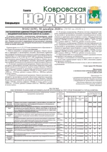 №102 30 декабря 2020 г. 6 802111О.99 .0.БА96АЮ58001 Реализация основных общеобразовательных программ основного общего образования 2,7478 2,8519 1,7191 2,3128 2,0974 1,9832 2,1707 2,1477 2,3722 2,9428 1,9182 2,4577 1,9051 1,8358 1,8202 2,1434 2,6253 0,4317 МБОУ Гимназия № 1 МБОУ ООШ № 2 МБОУ СОШ № 4 г. Коврова МБОУ СОШ № 5 МБОУ СОШ № 8 г.Коврова МБОУ СОШ № 9 МБОУ СОШ № 10 МБОУ СОШ № 11 МБОУ СОШ №14 МБОУ СОШ № 15 МБОУ СОШ № 17 МБОУ ООШ № 18 МБОУ СОШ № 19 г.Коврова МБОУ СОШ № 21 МБОУ СОШ № 22 МБОУ СОШ № 23 МБОУ СОШ № 24 МБОУ МУК 802111О.99. 0.БА96АЮ59001 Реализация основных общеобразовательных программ основного общего образования 1,00 1,00 1,00 1,00 1,00 1,00 1,00 1,00 9,7011 1,00 1,00 1,00 1,00 1,00 1,00 1,00 10,7521 МБОУ Гимназия № 1 МБОУ ООШ № 2 МБОУ СОШ № 4 г. Коврова МБОУ СОШ № 5 МБОУ СОШ № 8 г.Коврова МБОУ СОШ № 9 МБОУ СОШ № 10 МБОУ СОШ № 11 МБОУ СОШ №14 МБОУ СОШ № 15 МБОУ СОШ № 17 МБОУ ООШ № 18 МБОУ СОШ № 19 г.Коврова МБОУ СОШ № 21 МБОУ СОШ № 22 МБОУ СОШ № 23 МБОУ СОШ № 24 802112О.99. 0.ББ11АЮ58001 Реализация основных общеобразовательных программ среднего общего образования 2,8475 1,7571 4,4155 2,1437 2,0269 2,2186 2,1951 2,4156 3,0588 1,9780 1,9471 1,8763 1,8603 2,1907 2,7226 0,4413 МБОУ Гимназия № 1 МБОУ СОШ № 4 г. Коврова МБОУ СОШ № 5 МБОУ СОШ № 8 г.Коврова МБОУ СОШ № 9 МБОУ СОШ № 10 МБОУ СОШ № 11 МБОУ СОШ №14 МБОУ СОШ № 15 МБОУ СОШ № 17 МБОУ СОШ № 19 г.Коврова МБОУ СОШ № 21 МБОУ СОШ № 22 МБОУ СОШ № 23 МБОУ СОШ № 24 МБОУ МУК 802112О.99. 0.ББ11АЮ59001 Реализация основных общеобразовательных программ среднего общего образования 1,00 1,00 1,00 1,00 1,00 1,00 1,00 1,00 11,9162 7,7672 1,00 1,00 1,00 1,00 1,00 МБОУ Гимназия № 1 МБОУ СОШ № 4 г.Коврова МБОУ СОШ № 5 МБОУ СОШ № 8 г.Коврова МБОУ СОШ № 9 МБОУ СОШ № 10 МБОУ СОШ № 11 МБОУ СОШ №14 МБОУ СОШ № 15 МБОУ СОШ № 17 МБОУ СОШ № 19 г.Коврова МБОУ СОШ № 21 МБОУ СОШ № 22 МБОУ СОШ № 23 МБОУ СОШ № 24 802112О.99. 0.ББ11АЮ62001 Реализация основных общеобразовательных программ среднего общего образования 3,6183 МБОУ СОШ № 5 920700О.99. 0.АЗ22АА00001 Организация отдыха детей и молодежи 0,7729 1,2271 МБУ «ДОЛ «Лесной городок» МАУ ЗОЛ «Березка» 920700О.99. 0.АЗ22АА01001 Организация отдыха детей и молодежи 0,000000839 0,000001168 0,000000914 0,000001075 0,000000992 0,000001019 0,000001105 0,000000806 0,000001071 0,000000357 0,000001293 0,000001170 0,000000765 0,000000771 0,000001024 0,000000912 0,000000916 0,000001293 0,000003720 0,000001864 0,000000953 МБОУГимназия № 1 МБОУООШ № 2 МБОУСОШ № 4 г. Коврова МБОУСОШ № 5 МБОУСОШ № 8 г.Коврова МБОУСОШ № 9 МБОУСОШ № 10 МБОУСОШ № 11 МБОУСОШ №14 МБОУСОШ № 15 МБОУСОШ № 17 МБОУООШ № 18 МБОУ СОШ № 19 г.Коврова МБОУ СОШ № 21 МБОУ СОШ № 22 МБОУ СОШ № 23 МБОУ СОШ № 24 МБОУ ДО ДДТ ДДК «Дегтяревец» ЦДТ «Азимут» «ЦДОД «Родничок» 801011О.99. 0.БВ24ДЛ42000 Реализация основных общеобразовательных программ дошкольного образования 1,0887 МБДОУ № 12 ПОСТАНОВЛЕНИЕ АДМИНИСТРАЦИИ ГОРОДА КОВРОВА ВЛАДИМИРСКОЙ ОБЛАСТИ № 2455 ОТ 28.12.2020 Г. Об утверждении итоговых значений и величины составляющих базовых норматив затрат на оказание муниципальных услуг и территориальных корректирующих коэффициентов в сфере образования на 2021 год» В соответствии с постановлением администрации города Коврова от 09.10.2015 № 2558 «О порядке формирования муниципального задания на оказание муниципальных услуг (выполнения работ) в отношении муниципальных учреждений города Коврова и финансового обеспечения выполнения муниципального задания», на основании статей 31, 32 Устава муниципального образования город Ковров Владимирской области постановляю: 1. Утвердить базовые нормативы затрат на оказание муниципальных услуг для муниципальных учреждений, подведомственных Управлению образования, на 2021 год согласно приложению №1. 2. Утвердить территориа