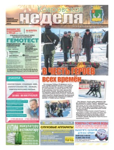 12+ Городская информационноаналитическая газета ÈÌÅÞÒÑß ÏÐÎÒÈÂÎÏÎÊÀÇÀÍÈß. ÏÐÎÊÎÍÑÓËÜÒÈÐÓÉÒÅÑÜ ÑÎ ÑÏÅÖÈÀËÈÑÒÎÌ реклама «КомпСлух» пр-т Ленина, 29 8-904-259-53-83 e-mail: KompSluh33@yandex.ru СЛУХОВЫЕ АППАРАТЫ ДИАГНОСТИКА СЛУХА, ПОДБОР, НАСТРОЙКА МИКРОАППАРАТЫ (НЕВИДИМКИ) ПРОДАЖА: батарейки ушные вкладыши тонкие трубочкифильтры вт, ср, чт, пт 11.00 –15.00 время работы АКУШЕРЫГИНЕКОЛОГИ ПЛЕТНЕВА СВЕТЛАНА ВЛАДИМИРОВНА ВОЛКОВА Рената Анатольевна прием, УЗИ, кольпоскопия, пренатальные скрининги. ВРАЧ УЛЬТРАЗВУКОВОЙ ДИАГНОСТИКИ ПОЛЯКОВА Виктория Сергеевна УЗИ брюшной полости, малого таза. Диагностика по беременности, молочные железы, лимфоузлы, щитовидная железа, артерии и вены, УЗИ сердца, сосуды головы и шеи. ПРИНИМАЕМ КОЛЛЕКТИВНЫЕ ЗАЯВКИ ВЫЕЗЖАЕМ НА ПРЕДПРИЯТИЕ ВНИМАНИЕ! ТЕСТ НА КОРОНАВИРУС за 1700 руб. срок – 1 день ГЕМОТЕСТ МЕДИЦИНСКАЯ ЛАБОРАТОРИЯ АНАЛИЗЫ УЗИ ВРАЧИ ВЫЕЗД МЕДСЕСТРЫ НА ДОМ ВНУТРИМЫШЕЧНЫЙ УКОЛ – 60 р. ВНУТРИВЕННЫЙ УКОЛ – 100 р. ВНУТРИВЕННОЕ КАПЕЛЬНОЕ ВЛИВАНИЕ – ОТ 207 р. ул. Строителей, д. 27/2, тел. 9-90-03, 8-961-254-98-00 ул. Чернышевского, д. 3, тел. 6-30-20, 8-961-254-98-00 Камешково, ул. Свердлова, д. 20, тел. 8-962-090-11-10 ИМЕЮТСЯ ПРОТИВОПОКАЗАНИЯ. НЕОБХОДИМА КОНСУЛЬТАЦИЯ СПЕЦИАЛИСТА *Акция действует до 30.09.2020г. Подробности о сроках, условиях и других действующих акциях уточняйте у администратора лабораторного отделения или на сайте. Акции и подарки предоставляет ООО «КОВРОВ-ТЕСТ». ОГРН 1163328051336, лицензия ЛО 33-01-002804 от 26.04.2019 г. Реклама НА АНТИТЕЛА G+M – 700 руб. ДОМ – 60 р ТВОЯ БИОХИМИЯ 8 главных показателей за 690 р. КЛЮЧ К ЗДОРОВЬЮ гормоны щитовидной железы ТТГ, Т4, Т3 за 690 р. Акция* ɇȺ ȾɈɆɍ ȻȿɁ ɋɇəɌɂə ȻȿɁ ɇȺɊɍɒȿɇɂə ɉɅɈɆȻ ɊȺȻɈɌȺȿɆ ɋ ȾɈ ȻȿɁ ɈȻȿȾȺ ɂ ȼɕɏɈȾɇɕɏ ɂɉ ɉȿɌɊɈȼȺ ɘ Ƚ ȺɌɌȿɋɌȺɌ ȺɄɄɊȿȾɂɌȺɐɂɂ 5$ 58 ȼɕȾȺɇ ɝ ȼ ɫɥɭɱɚɟ ɧɟɩɪɢɝɨɞɧɨɫɬɢ ɫɱɟɬɱɢɤɚ ɨɩɥɚɬɚ ɡɚ ɩɨɜɟɪɤɭ ɧɟ ɜɡɢɦɚɟɬɫɹ Ковровская № 13 (652) 26 февраля 2021 г. реклама КУПИМ макулатуру и стеклотару Ул. Свердлова, д. 91 Режим работы: пн-пт – 7.00-17.00, сб – 8.00-14.00 ™ 8-904-955-55-01, 8-904-955-55-81 реклама неделя На площади Победы 23 февраля состоялся торжественный митинг в честь Дня защитника Отечества, который олицетворяет многовековую историю армии России. В нем приняли участие глава города Коврова Елена Фомина, председатель Совета народных депутатов Анатолий Зотов, сотрудники администрации города, депутаты, представители общественных организаций, военнослужащие 467 Окружного учебного центра, а также жители города. Они пришли отдать дань уважения тем, кто преданно служит Родине, защищает безопасность нашей страны, бережет мирную жизнь. В этот день вспомнили и тех, кто пал в боях при исполнении своего долга, тех, кто погиб во время Великой Отечественной войны. В память о защитниках нашей Родины к монументу Славы участники митинга торжественно возложили гирлянду и цветы. Собравшиеся минутой молчания почтили память героев. Прозвучал Гимн России и оружей ный салют. Н П б ф В ЧЕСТЬ ГЕРОЕВ всех всех времён времён
