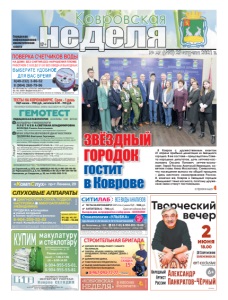 ДЕЛАЕМ ВСЕ ВИДЫ РАБОТ С НАШЕГО МАТЕРИАЛА ЗАБОРЫ, КРЫШИ, НАВЕСЫ, БЕСЕДКИ, ФУНДАМЕНТ, ПЕЧКИ, САЙДИНГ, ДОМА С НУЛЯ. ДОМКРАТИМ ДОМА. РАБОТАЕМ БЕЗ ПРЕДОПЛАТЫ. ВЫЕЗД ЗАМЕРЩИКА БЕСПЛАТНО. РАБОТАЕМ БЕЗ ВЫХОДНЫХ. СТРОИТЕЛЬНАЯ БРИГАДА 8-967-093-77-77 – Роман Пенсионерам СКИДКА 15% реклама ИМЕЮТСЯ ПРОТИВОПОКАЗАНИЯ, ПРОКОНСУЛЬТИРУЙТЕСЬ СО СПЕЦИАЛИСТОМ МЕДИЦИНСКАЯ ЛАБОРАТОРИЯ СИТИЛАБ ул. Лопатина, д. 13/1. 63-7-63, 8-904-033-10-60 Работаем без выходных – с 7.00 до 19.00. Суббота и воскресенье – с 8.00 до 14.00 УДАЛЕНИЕ ЛЕЧЕНИЕ ПРОТЕЗИРОВАНИЕ Стоматология «УЛЫБКА» реклама Лиц. № 34-01-000176 ФС по надзору в сфере здравоохранения. ПЕНСИОНЕРАМ СКИДКА 10% ВСЕ ВИДЫ АНАЛИЗОВ ТЕСТЫ НА КОРОНАВИРУС SAPS-Cov-2, мазок ПЦР – 1590 руб. АНТИТЕЛА G – 790 руб. Срок от одного дня Выезд на дом, на предприятие и забор крови – БЕСПЛАТНО! 12+ Городская информационноаналитическая газета ÈÌÅÞÒÑß ÏÐÎÒÈÂÎÏÎÊÀÇÀÍÈß. ÏÐÎÊÎÍÑÓËÜÒÈÐÓÉÒÅÑÜ ÑÎ ÑÏÅÖÈÀËÈÑÒÎÌ реклама «КомпСлух» пр-т Ленина, 29 8-904-259-53-83 e-mail: KompSluh33@yandex.ru СЛУХОВЫЕ АППАРАТЫ ДИАГНОСТИКА СЛУХА, ПОДБОР, НАСТРОЙКА МИКРОАППАРАТЫ (НЕВИДИМКИ) ПРОДАЖА: батарейки ушные вкладыши тонкие трубочкифильтры вт, ср, чт, пт 11.00 –15.00 время работы ɇȺ ȾɈɆɍ ȻȿɁ ɋɇəɌɂə ȻȿɁ ɇȺɊɍɒȿɇɂə ɉɅɈɆȻ ɊȺȻɈɌȺȿɆ ɋ ȾɈ ȻȿɁ ɈȻȿȾȺ ɂ ȼɕɏɈȾɇɕɏ ɂɉ ɉȿɌɊɈȼȺ ɘ Ƚ ȺɌɌȿɋɌȺɌ ȺɄɄɊȿȾɂɌȺɐɂɂ 5$ 58 ȼɕȾȺɇ ɝ ȼ ɫɥɭɱɚɟ ɧɟɩɪɢɝɨɞɧɨɫɬɢ ɫɱɟɬɱɢɤɚ ɨɩɥɚɬɚ ɡɚ ɩɨɜɟɪɤɭ ɧɟ ɜɡɢɦɚɟɬɫɹ Ковровская № 29 (668) 23 апреля 2021 г. неделя реклама КУПИМ макулатуру и стеклотару Ул. Свердлова, д. 91 Режим работы: пн-пт – 7.00-17.00, сб – 8.00-14.00 8-904-955-55-01, 8-904-955-55-81 страница 4 АКУШЕРЫ-ГИНЕКОЛОГИ П Л Е Т Н Е В А СВЕТЛАНА ВЛАДИМИРОВНА ВОЛКОВА Рената Анатольевна прием, УЗИ, кольпоскопия, пренатальные скрининги. ВРАЧ УЛЬТРАЗВУКОВОЙ ДИАГНОСТИКИ ПОЛЯКОВА Виктория Сергеевна УЗИ брюшной полости, малого таза. Диагностика по беременности, молочные железы, лимфоузлы, щитовидная железа, артерии и вены, УЗИ сердца, сосуды головы и шеи. ПРИНИМАЕМ КОЛЛЕКТИВНЫЕ ЗАЯВКИ. ВЫЕЗЖАЕМ НА ПРЕДПРИЯТИЕ ТЕСТЫ НА КОРОНАВИРУС. Срок - 1 день ПЦР-мазок – 1700 руб., антитела G+М – 700 руб. ГЕМОТЕСТ МЕДИЦИНСКАЯ ЛАБОРАТОРИЯ АНАЛИЗЫ УЗИ ВРАЧИ ВЫЕЗД МЕДСЕСТРЫ НА ДОМ ВНУТРИМЫШЕЧНЫЙ УКОЛ – 60 р. ВНУТРИВЕННЫЙ УКОЛ – 100 р. ВНУТРИВЕННОЕ КАПЕЛЬНОЕ ВЛИВАНИЕ – ОТ 207 р. ул. Строителей, д. 27/2, тел. 8(49232) 9-90-03, 8-961-254-98-00 ул. Чернышевского, д. 3, тел. 8(49232) 6-30-20, 8-961-254-98-00 Камешково, ул. Свердлова, д. 20, тел. 8-962-090-11-10 ИМЕЮТСЯ ПРОТИВОПОКАЗАНИЯ. НЕОБХОДИМА КОНСУЛЬТАЦИЯ СПЕЦИАЛИСТА Реклама ПЕРЕД ВАКЦИНАЦИЕЙ ОТ COVID-19 – 2390 руб. (коронавирус антитела IgG (колич.), коронавирус антитела IgM (колич.), клинический анализ с лейкоцитарной формулой и СОЭ, АЛТ, АСТ, креатинин, иммуноглобулин IgE.) РИСК ТЯЖЕЛОГО ТЕЧЕНИЯ COVID-19 – 590 руб. (гликированный гемоглобин (HbA1c), МНО : ПТВ, ПТИ). Акция* *Акции действуют до 31 марта 2021 г. Подробности о сроках и других действующих акциях уточняйте у администратора Лабораторного отделения или на сайте. Акции и подарки предоставляет ООО «КОВРОВ-ТЕСТ», ОГРН 1163328051336, лицензия ЛО-33-01002804 от 26.04.2019 г. Реклама реклама в киосках «Роспечати» «КОВРОВСКАЯ НЕДЕЛЯ» В Ковров с дружественным визитом 21 апреля прибыла делегация из Звездного городка. В ее составе – председатель Совета народных депутатов, дочь летчика-космонавта Оксана Попович, летчик-космонавт, Герой России Анатолий Иванишин, советник главы Анна Москатова. Символично, что посещение выпало на общий праздник – День местного самоуправления России. И, конечно же, Ковров и Звездны