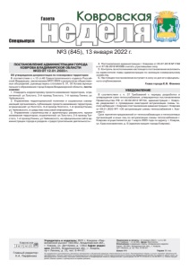 №3 (845), 13 января 2022 г. ǺDzDZDzǸȌ ǸȜȐȞȜȐȟȘȎȭ Спецвыпуск Газета ПОСТАНОВЛЕНИЕ АДМИНИСТРАЦИИ ГОРОДА КОВРОВА ВЛАДИМИРСКОЙ ОБЛАСТИ №23 ОТ 12.01.2023 г. Об утверждении документации по планировке территории В соответствии с ч.13 ст.46 Градостроительного кодекса Российской Федерации, заключением №27/2022 о результатах общественных обсуждений, руководствуясь статьями 6, 31, 32 Устава муниципального образования город Ковров Владимирской области, постановляю: 1. Утвердить корректировку проекта межевания территории, ограниченной: ул.Толстого, 3-й проезд Толстого, 1-й проезд Глинки, ул. Чайковского. 2. Управлению территориальной политики и социальных коммуникаций организовать публикацию проекта межевания территории, ограниченной: ул.Толстого, 3-й проезд Толстого, 1-й проезд Глинки, ул.Чайковского, в средствах массовой информации. 3. Управлению строительства и архитектуры разместить проект межевания территории, ограниченной: ул.Толстого, 3-й проезд Толстого, 1-й проезд Глинки, ул.Чайковского, на официальном сайте администрации города в разделе «градостроительная деятельность». 4. Постановления администрации г. Коврова от 23.07.2018 №1748 и от 27.09.2018 №2366 считать утратившими силу. 5. Контроль за исполнением настоящего постановления возложить на заместителя главы администрации по жилищно-коммунальному хозяйству. 6. Настоящее постановление вступает в силу со дня его официального опубликования. Глава города Е.В. Фомина УВЕДОМЛЕНИЕ В соответствии с п. 37 Требований к порядку разработки и утверждения схем теплоснабжения, утвержденных постановлением Правительства РФ от 22.02.2012 №154, администрация г. Коврова уведомляет о проведении ежегодной актуализации схемы теплоснабжения г. Коврова (постановление администрации г. Коврова от 09.01.2023 №1 «Об актуализации схемы теплоснабжения г. Коврова»). Срок принятия предложений от теплоснабжающих и теплосетевых организаций и иных лиц по актуализации схемы теплоснабжения г. Коврова осуществляется до 1 марта 2023 года по адресу: г. Ковров, ул. Краснознаменная, д. 6 (администрация города Коврова). Учредитель и издатель: МУП г. Коврова «Первомайский рынок» (601902, Владимирская обл., г. Ковров, ул. Дегтярева, д. 136а) Адрес редакции: 601901, Владимирская обл., г. Ковров, пр-т Ленина, д. 33, тел. 6-44-07. Подписано в печать: 13 января 2023 г. в 11.50 (по графику – в 12.00). Цена: бесплатно Отпечатано в редакции газеты «Ковровская неделя» Адрес: 601901, Владимирская обл., г. Ковров, пр-т Ленина, д. 33. Тел. 6-44-07. Заказ №8 Тираж 50 экз. За содержание и достоверность рекламных материалов и объявлений редакция ответственности не несет. Рекламируемые товары и услуги подлежат обязательной сертификации. Письма и рукописи не рецензируются и не возвращаются. Газета зарегистрирована Управлением Федеральной службы по надзору в сфере связи, информационных технологий и массовых коммуникаций по Владимирской области (свидетельство о регистрации ПИ № ТУ 33-00151 от 16.09.2011 г.). Статьи под рубрикой «Бизнес-проект» публикуются на правах рекламы. Главный редактор: Н.А. Парфёнова