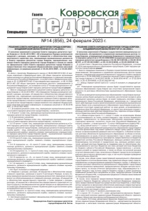 №14 (856), 24 февраля 2023 г. ǺDzDZDzǸȌ ǸȜȐȞȜȐȟȘȎȭ Спецвыпуск Газета РЕШЕНИЕ СОВЕТА НАРОДНЫХ ДЕПУТАТОВ ГОРОДА КОВРОВА ВЛАДИМИРСКОЙ ОБЛАСТИ №38 ОТ 21.02.2023 г. О внесении изменений в решение Совета народных депутатов города Коврова от 25.03.2015 №61 «Об утверждении Порядка размещения сведений о доходах, расходах, об имуществе и обязательствах имущественного характера лиц, замещающих муниципальные должности в Совете народных депутатов города Коврова, муниципальных служащих Совета народных депутатов города Коврова и членов их семей на официальном сайте Совета народных депутатов города Коврова и предоставления этих сведений общероссийским средствам массовой информации» (в редакции решений от 25.05.2016 №87, от 24.02.2021 №32) В связи с принятием Федерального закона от 06.02.2023 №12-ФЗ «О внесении изменений в Федеральный закон «Об общих принципах организации публичной власти в субъектах Российской Федерации» и отдельные законодательные акты Российской Федерации», в соответствии с Федеральными законами от 25.12.2008 №273-ФЗ «О противодействии коррупции», от 06.10.2003 №131-ФЗ «Об общих принципах организации местного самоуправления в Российской Федерации», на основании статьи 27 Устава муниципального образования город Ковров Совет народных депутатов города Коврова решил: 1. Внести следующие изменения в решение Совета народных депутатов города Коврова от 25.03.2015 №61 «Об утверждении Порядка размещения сведений о доходах, расходах, об имуществе и обязательствах имущественного характера лиц, замещающих муниципальные должности в Совете народных депутатов города Коврова, муниципальных служащих Совета народных депутатов города Коврова и членов их семей на официальном сайте Совета народных депутатов города Коврова и предоставления этих сведений общероссийским средствам массовой информации» (в редакции решений от 25.05.2016 №87, от 24.02.2021 №32): 1.1. В названии решения слова «лиц, замещающих муниципальные должности в Совете народных депутатов города Коврова,» исключить. 1.2. В пункте 1 слова «лиц, замещающих муниципальные должности в Совете народных депутатов города Коврова,» исключить. 1.3. В приложении к решению: 1.3.1. В названии Порядка слова «лиц, замещающих муниципальные должности в Совете народных депутатов города Коврова,» исключить. 1.3.2. В пункте 1 слова «лиц, замещающих муниципальные должности в Совете народных депутатов города Коврова, муниципальных служащих Совета народных депутатов города Коврова, замещающих должности муниципальной службы (далее – лица, замещающие муниципальные должности, должности муниципальной службы)» заменить словами «муниципальных служащих Совета народных депутатов города Коврова (далее – муниципальные служащие), замещающих должности муниципальной службы». 1.3.3. В пункте 2 слова «лиц, замещающих муниципальные должности, должности муниципальной службы» заменить словами «муниципальных служащих». 1.3.4. В подпунктах «а», «б» пункта 2 слова «лицу, замещающему муниципальную должность, должность муниципальной службы» заменить словами «муниципальному служащему». 1.3.5. В подпунктах «в», «г» пункта 2 слова «лица, замещающего муниципальную должность, должность муниципальной службы» заменить словами «муниципального служащего». 1.3.6. В подпунктах «а», «б», «в» пункта 3 слова «лица, замещающего муниципальную должность, должность муниципальной службы» 
