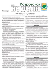 3 №20 17 марта 2023 г. Подготовка и проведение электронного аукциона осуществляются в порядке, предусмотренном статьями 39.11, 39.12 и 39.13 Земельного Кодекса Российской Федерации. Условия проведения аукциона: 1. Предметом аукциона в электронной форме является право заключения договора аренды на сформированный земельный участок с разрешенным видом использования – производственная деятельность. Лот №1: Местоположение участка: Российская Федерация, область Владимирская, МО г. Ковров (городской округ), г. Ковров, в районе дома 1 по ул. Фруктовая Площадь земельного участка: 4375±23 кв.м. Категория земель: земли населенных пунктов Кадастровый номер: 33:20:012504:855 Вид разрешенного использования: производственная деятельность. 2. Начальный размер ежегодной арендной платы земельного участка – 1 000 000 (один миллион) руб. 00 коп.; «шаг» аукциона – 30 000 (тридцать тысяч) руб. 00 коп.; сумма задатка – 800 000 (восемьсот тысяч) руб. 00 коп. 3. Время и дата начала и окончания приема заявок в электронной форме с прилагаемыми к ним документами – с 08 час. 00 мин. 16 марта 2023г. до 17 час. 00 мин. 14 апреля 2023г. Место подачи (приема) заявок и документов: электронная площадка АО «Единая электронная торговая площадка» https://www.roseltorg.ru/. Срок рассмотрения заявок на участие в аукционе не может превышать три рабочих дня с даты окончания срока приема документов. Дата, время и место определения участников: 17 апреля 2023 года в 11 час. 00 мин. в здании Администрации г. Коврова по адресу: ул. Краснознаменная, д. 6, каб. №204. Проведение аукциона назначить на 19 апреля 2023 года в 09 час. 00 мин. на электронной торговой площадке АО «Единая электронная торговая площадка» www.roseltorg.ru. 4. Осмотр земельного участка претендентом осуществляется самостоятельно. С иными сведениями, в т.ч. формой заявки об участии в торгах, планом земельного участка претенденты могут ознакомиться по адресу: г. Ковров, ул. Краснознаменная, д. 6, каб. 403, тел. 3-51-46, или на официальном сайте администрации г. Коврова www.kovrov-gorod.ru. (раздел аукционы и торги), на официальном сайте Российской Федерации www.torgi.gov.ru., а также на электронной площадке https://www.roseltorg.ru/. УВЕДОМЛЕНИЕ об эвакуации ВАЗ 21150, грз О 550 НВ 33 расположенного по адресу г.Ковров ул.Муромская д.11а. Уведомляем Вас о том, что 15.03.2023 года администрацией города Коврова Владимирской области проведено повторное комиссионное обследование принадлежащего Вам транспортного средства, расположенного по адресу г.Ковров ул.Муромская д.11а. По результатам обследования было установлено, что транспортное средство ВАЗ 21150, грз О 550 НВ 33, имеет признаки брошенного (бесхозяйного): технически неисправно, кузовные детали транспортного средства имеют сквозные коррозионные отверстия, отсутствуют стеклоочистители, отсутствуют явные признаки эксплуатации и возможности перемещения. В соответствии с Решением Совета народных депутатов города Коврова Владимирской области от 26 июля 2017 г. №162 «Об утверждении правил благоустройства территории муниципального образования города Ковров Владимирской области» (в редакции решение от 30.05.2018 №177) в разделе 20 «Брошенные транспортные средства» приведен порядок эвакуации транспортных средств. ТРЕБУЕМ своими силами и за свой счет эвакуировать (переместить) указанное транспортное средство в предназначенное для хранения транспортных средств место или утилизировать в случае прекращен