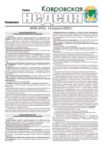 №28 (870), 14 апреля 2023 г. ǺDzDZDzǸȌ ǸȜȐȞȜȐȟȘȎȭ Спецвыпуск Газета ЗАКЛЮЧЕНИЕ №5/2023 О РЕЗУЛЬТАТАХ ПУБЛИЧНЫХ СЛУШАНИЙ 11.04.2023 Наименование проекта, рассмотренного на публичных слушаниях: проект решения о предоставлении разрешения на отклонение от предельных параметров разрешенного строительства, реконструкции объекта капитального строительства (индивидуальный жилой дом) на земельном участке с кадастровым номером 33:20:015409:13, расположенном по адресу: Владимирская область, город Ковров, ул. Хвойная, дом 62. Инициатор публичных слушаний: Бойнов Э.В. Организатор публичных слушаний: Комиссия по землепользованию и застройке города Коврова. Основание для проведения публичных слушаний: постановление администрации города Коврова от 13.03.2023 №450 «О проведении публичных слушаний по проекту решения о предоставлении разрешения на отклонение от предельных параметров разрешенного строительства, реконструкции объекта капитального строительства». Официальная публикация оповещения о проведении публичных слушаний: в газете «Ковровская неделя», выпуск №19 от 17 марта 2023г. Информационные материалы к проекту были размещены: на официальном сайте администрации г.Коврова kovrov-gorod.ru в разделе «градостроительная деятельность», подраздел «проекты, рассматриваемые на публичных слушаниях» с 27 марта 2023г. по 31 марта 2023г. Экспозиция проекта проводилась: с 27 марта 2023г. по 31 марта 2023г. по адресу: г.Ковров, ул. Краснознаменная, д. 6, каб. 310 Предложения и замечания участников публичных слушаний принимались: с 27 марта 2023г. по 31 марта 2023г. Собрание участников публичных слушаний состоялось: 31 марта 2023г. в 14:00 по адресу: г.Ковров, Краснознаменная ул., д.6, актовый зал. Заключение подготовлено на основании протокола №5/2023 публичных слушаний по проектам градостроительных решений. В период проведения публичных слушаний письменные предложения и замечания не поступили. Рассмотрев представленные документы, выслушав мнение членов комиссии по землепользованию и застройке г.Коврова (протокол №12 от 10.04.2023), в результате обсуждения принято решение: I. Рекомендовать Главе города предоставить разрешение на отклонение от предельных параметров разрешенного строительства, реконструкции объекта капитального строительства (индивидуального жилого дома) на земельном участке с кадастровым номером 33:20:015409:13, расположенном по адресу: Владимирская область, город Ковров, ул. Хвойная, дом 62. II. Опубликовать результаты публичных слушаний в официальном печатном издании администрации г.Коврова и разместить на официальном сайте муниципального образования в сети «Интернет». ЗАКЛЮЧЕНИЕ №6/2023 О РЕЗУЛЬТАТАХ ПУБЛИЧНЫХ СЛУШАНИЙ 11.04.2023 Наименование проекта, рассмотренного на публичных слушаниях: корректировка проекта межевания территории, ограниченной улицами: Летняя, Лесная, Урожайная, Воробьева. Инициатор публичных слушаний: Плешакова Ю.А. Организатор публичных слушаний: Комиссия по землепользованию и застройке города Коврова. Основание для проведения публичных слушаний: постановление администрации города Коврова от 13.03.2023 №449 «О проведении публичных слушаний по корректировке проекта межевания территории, ограниченной улицами: Летняя, Лесная, Урожайная, Воробьева». Официальная публикация оповещения о проведении публичных слушаний: в газете «Ковровская неделя», выпуск №19 от 17 марта 2023г. Инфо
