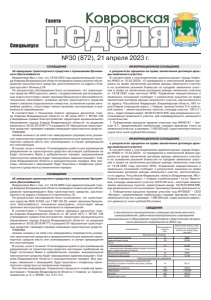 №30 (872), 21 апреля 2023 г. ǺDzDZDzǸȌ ǸȜȐȞȜȐȟȘȎȭ Спецвыпуск Газета СООБЩЕНИЕ об эвакуации транспортного средства с признаками брошенного (бесхозяйного) Уведомляем Вас о том, что 19.04.2023 года администрацией города Коврова Владимирской области проведено комиссионное обследование транспортного средства, расположенного по адресу г.Ковров проспект Ленина д.24. По результатам обследования было установлено, что транспортное средство ВАЗ красного цвета, государственные регистрационные знаки отсутствуют, имеет признаки брошенного (бесхозяйного): технически неисправно, кузовные детали транспортного средства имеют сквозные коррозионные отверстия, остекление кузова автомобиля разбито, отсутствуют явные признаки эксплуатации и возможности перемещения. В соответствии с Решением Совета народных депутатов города Коврова Владимирской области от 26 июля 2017 г. №162 «Об утверждении правил благоустройства территории муниципального образования города Ковров Владимирской области» (в редакции решение от 30.05.2018 №177) в разделе 20 «Брошенные транспортные средства» приведен порядок эвакуации транспортных средств. ТРЕБУЕМ своими силами и за свой счет эвакуировать (переместить) указанное транспортное средство в предназначенное для хранения транспортных средств место или утилизировать в случае прекращения его эксплуатации. В случае, если в течение 10 календарных дней со дня размещения уведомления на транспортном средстве настоящее требование не будет исполнено Вами в добровольном порядке, вышеуказанное транспортное средство будет эвакуировано администрацией г. Коврова Владимирской области в принудительном порядке. Все расходы, связанные с эвакуацией, будут взысканы с владельца транспортного средства в установленном порядке. СООБЩЕНИЕ об эвакуации транспортного средства с признаками брошенного (бесхозяйного) Уведомляем Вас о том, что 19.04.2023 года администрацией города Коврова Владимирской области проведено комиссионное обследование принадлежащего Вам транспортного средства, расположенного по адресу г.Ковров ул.Строителей д.16. По результатам обследования было установлено, что транспортное средство ВАЗ 21043, грз Т 967 ОА 33, имеет признаки брошенного (бесхозяйного): технически неисправно, отсутствуют явные признаки эксплуатации и возможности перемещения. В соответствии с Решением Совета народных депутатов города Коврова Владимирской области от 26 июля 2017 г. №162 «Об утверждении правил благоустройства территории муниципального образования города Ковров Владимирской области» (в редакции решение от 30.05.2018 №177) в разделе 20 «Брошенные транспортные средства» приведен порядок эвакуации транспортных средств. ТРЕБУЕМ своими силами и за свой счет эвакуировать (переместить) указанное транспортное средство в предназначенное для хранения транспортных средств место или утилизировать в случае прекращения его эксплуатации. В случае, если в течение 10 календарных дней со дня размещения уведомления на транспортном средстве настоящее требование не будет исполнено Вами в добровольном порядке, вышеуказанное транспортное средство будет эвакуировано администрацией г. Коврова Владимирской области в принудительном порядке. Все расходы, связанные с эвакуацией, будут взысканы с владельца транспортного средства в установленном порядке. Контактная информа