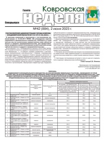 2 №42 2 июня 2023 г. ПОСТАНОВЛЕНИЕ АДМИНИСТРАЦИИ ГОРОДА КОВРОВА ВЛАДИМИРСКОЙ ОБЛАСТИ №1163 ОТ 31.05.2023 г. О внесении изменений в приложение №1 к постановлению администрации города Коврова от 19.12.2022 №3065 «Об утверждении перечней предприятий, организаций, учреждений, обществ для исполнения уголовных наказаний осужденным в виде исправительных и обязательных работ на территории города Коврова Владимирской области» В соответствии со статьями 25, 39 Уголовно-исполнительного кодекса Российской Федерации, в целях обеспечения занятости осужденных, их исправления и предупреждения совершения новых преступлений, решения задач социально-экономического развития и благоустройства города Коврова, руководствуясь статьями 32, 35 Устава муниципального образования город Ковров, постановляю: 1. Внести изменения в приложение №1 к постановлению администрации города Коврова Владимирской области от 19.12.2022 №3065 «Об утверждении перечней предприятий, организаций, учреждений, обществ для исполнения уголовных наказаний осужденным в виде исправительных и обязательных работ на территории города Коврова Владимирской области», в соответствии с приложением к настоящему постановлению. 2. Контроль за исполнением настоящего постановления возложить на заместителя главы администрации. 3. Настоящее постановление вступает в силу со дня его официального опубликования. Глава города Е.В. Фомина Сведения о недвижимом имуществе Сведения о движимом имуществе Кадастровый номер <5> Техническое состояние объекта недвижимости<6> Категория земель <7> Вид разрешенного использования <8> Номер Тип (кадастровый, условный, устаревший) Государственный регистрационный знак (при наличии) Марка, модель Год выпуска Состав (принадлежности) имущества <9> 8 9 10 11 12 13 14 15 16 33:20:011805:13 кадастровый Пригодно к эксплуатации земли населенных пунктов для размещения производственно-лабораторного корпуса - - - - 33:20:013008:461 кадастровый Пригодно к эксплуатации земли населенных пунктов многоэтажная жилая застройка - - - - 33:20:013102:181 кадастровый Пригодно к эксплуатации земли населенных пунктов многоквартирный дом - - - - 33:20:013203:500 кадастровый Пригоден к эксплуатации земли населенных пунктов многоквартирный дом - - - - 33:20:014731:171 кадастровый Пригоден к эксплуатации земли населенных пунктов для объектов жилой застройки - - - - 33:20:015505:491 кадастровый Пригоден к эксплуатации земли населенных пунктов многоквартирный дом - - - - 33:20:015505:491 кадастровый Пригоден к эксплуатации земли населенных пунктов многоквартирный дом - - - - 33:20:015505:491 кадастровый Пригоден к эксплуатации земли населенных пунктов многоквартирный дом - - - - 33:20:015505:1443 кадастровый Пригоден к эксплуатации земли населенных пунктов для размещения объектов розничной торговли - - - - 33:20:011101:700 кадастровый Пригодно к эксплуатации земли населенных пунктов - - - - - 33:20:010902:364 кадастровый Пригодно к эксплуатации земли населенных пунктов - - - - - 33:20:010902:574 кадастровый Пригодно для эксплуатации Земли населенных пунктов - - - - - - - Пригодно для эксплуатации Земли населенных пунктов - - - - - Сведения о правообладателях и о правах третьих лиц на имущество Для договоров аренды и безвозмездного пользования Наименование правообладателя <11> Наличие ограниченного вещного права на имущество <12> ИНН правообладателя<13> Контактный номер телефона <14> Адрес электронной почты<15> Наличие права ар