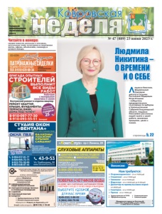 Городская информационноаналитическая газета 12+ Ковровская ɇȺ ȾɈɆɍ ȻȿɁ ɋɇəɌɂə ȻȿɁ ɇȺɊɍɒȿɇɂə ɉɅɈɆȻ ɊȺȻɈɌȺȿɆ ɋ ȾɈ ȻȿɁ ɈȻȿȾȺ ɂ ȼɕɏɈȾɇɕɏ ɂɉ ɉȿɌɊɈȼȺ ɘ Ƚ ȺɌɌȿɋɌȺɌ ȺɄɄɊȿȾɂɌȺɐɂɂ 5$ 58 ȼɕȾȺɇ ɝ ȼ ɫɥɭɱɚɟ ɧɟɩɪɢɝɨɞɧɨɫɬɢ ɫɱɟɬɱɢɤɚ ɨɩɥɚɬɚ ɡɚ ɩɨɜɟɪɤɭ ɧɟ ɜɡɢɦɚɟɬɫɹ 8-904-037-81-77 8-920-945-72-73 8-915-751-50-50 8-903-648-87-44 СТУДИЯ ОКОН «ВЕНТАНА» Тепло и уют в вашем доме реклама Ул. Грибоедова, 50 www.oknaventana33.ru 43-9-53 ЗАБЕРЕМ СТАРЫЕ РАМЫ ÎÊÍÀ ÏÂÕ ÑÊÈÄÊÈ! äî 30% Мы гарантируем качество и надежность! СУШИЛКА ДЛЯ БЕЛЬЯ В ПОДАРОК!* Принимаем оплату картой. *Подробности узнавайте по телефонам БАЛКОНЫ ЛОДЖИИ КРЫШИ САЙДИНГ Демонтаж бесплатно ÈÌÅÞÒÑß ÏÐÎÒÈÂÎÏÎÊÀÇÀÍÈß. ÏÐÎÊÎÍÑÓËÜÒÈÐÓÉÒÅÑÜ ÑÎ ÑÏÅÖÈÀËÈÑÒÎÌ реклама «КомпСлух» пр-т Ленина, 29 8-904-259-53-83 www.korrekcia-sluha.ru СЛУХОВЫЕ АППАРАТЫ ДИАГНОСТИКА СЛУХА, ПОДБОР, НАСТРОЙКА МИКРОАППАРАТЫ (НЕВИДИМКИ) ПРОДАЖА: батарейки ушные вкладыши тонкие трубочкифильтры вт, ср, чт, пт 11.00 –15.00 время работы Св. ИФНС РФ №8 по Влад.обл. 33 №001587735 Оториноларинголог – з/п от 70000 руб. Стоматолог – з/п от 70000 руб. Гинеколог – з/п от 70000 руб. Медсестра – з/п от 38500 руб. до 41000 руб. Диспетчер по приему вызовов скорой – з/п 28000 руб. Санитарка – з/п от 20000 руб. Прачка – з/п от 19000 руб. Нам требуются: y Трудоустройство по ТК РФ y Официальный доход y Социальный пакет y Сменный график Обращаться по адресу: ул. Ватутина, 88 (офис ООО «Первый КМЦ», рядом с OZON) +7 (960) 730-57-37, Татьяна Вакансии: реклама свежие новости, рассказы о земляках, актуальные темы, культурная и спортивная жизнь, афиша, объявления, сканворд и немного юмора. Читайте в номере: Патронажныесиделки на дому и в стационаре Тел. 8-910-678-06-34 заботящееся о нуждающихся ООО «АЗОН» реклама Агентство, Рег. №73 от 09.09.2016 г. Деп. соц. защиты Работает квалифицированный медперсонал АКЦИОНЕРНОМУ ОБЩЕСТВУ «ВСЕРОССИЙСКИЙ НАУЧНО-ИССЛЕДОВАТЕЛЬСКИЙ ИНСТИТУТ «СИГНАЛ» в связи с увеличением объемов производства на постоянную работу ТРЕБУЮТСЯ работники следующих специальностей: ○ЗАВЕДУЮЩИЙ ЦЕХОМ ОБЩЕСТВЕННОГО ПИТАНИЯ ○УБОРЩИК ПРОИЗВОДСТВЕННЫХ И СЛУЖЕБНЫХ ПОМЕЩЕНИЙ ○САДОВНИК ○ПОДСОБНЫЙ РАБОЧИЙ ○КОНДИТЕР y Трудоустройство по TK РФ y Полный социальный пакет Обращаться: г. Ковров, ул. Крупской, д. 57 E-mail: mail@vniisignal.ru 90-330, 3-18-66 реклама страницы 5, 22 реклама 8-910-097-77-30 8-910-093-55-51 Валерий 25 Внутренний ремонт и отделка квартир Людмила Никитина – О ОВРЕМЕНИ ВРЕМЕНИ И О СЕБЕ № 47 (889) 23 июня 2023 г. Людмила Никитина, федеральный помощник депутата Госдумы Российской Федерации Игоря Игошина – победитель предварительного голосования по выборам в Законодательное Собрание Владимирской области. Людмила Николаевна рассказала нашей газете о своей работе, жизненных принципах, делах и планах.