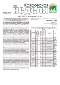 №60 (902), 4 августа 2023 г. ǺDzDZDzǸȌ ǸȜȐȞȜȐȟȘȎȭ Спецвыпуск Газета ПОСТАНОВЛЕНИЕ АДМИНИСТРАЦИИ ГОРОДА КОВРОВА ВЛАДИМИРСКОЙ ОБЛАСТИ №1781 ОТ 01.08.2023 г. Об утверждении перечня мест для размещения нестационарных объектов по оказанию услуг населению на территории муниципального образования города Ковров Владимирской области В целях создания условий для оказания услуг населению, упорядочения размещения и функционирования нестационарных объектов на территории города, руководствуясь Гражданским кодексом Российской Федерации, Земельным кодексом Российской Федерации, Федеральным законом от 25.10.2001 №137-ФЗ «О введении в действие Земельного кодекса Российской Федерации», Федеральным законом от 06.10.2003 №131-ФЗ «Об общих принципах организации местного самоуправления в Российской Федерации», Федеральным законом от 24.07.2007 №209-ФЗ «О развитии малого и среднего предпринимательства в Российской Федерации», постановлением администрации города Коврова от 25.01.2022 №91 «Об утверждении порядка заключения договоров на размещение нестационарных торговых объектов на территории муниципального образования город Ковров без предоставления земельного участка» (вместе с «Порядком организации и проведения аукциона на право заключения договоров на размещение нестационарных торговых объектов на территории муниципального образования город Ковров без предоставления земельного участка»), на основании статей 32, 35, 46 Устава муниципального образования город Ковров, постановляю: 1. Утвердить перечень мест для размещения нестационарных объектов по оказанию услуг населению на территории муниципального образования город Ковров согласно приложению №1 (текстовая часть) и приложению №2 (графическая часть) к настоящему постановлению. 2. Определить уполномоченным органом по определению и утверждению мест для размещения нестационарных объектов по оказанию услуг населению на территории города комиссию по землепользованию и застройке муниципального образования город Ковров. 3. Определить отдел торговли и сферы услуг управления по экономической политике, стратегическому развитию и инвестициям администрации города Коврова ответственным за подготовку материалов по вопросам определения мест для размещения нестационарных объектов по оказанию услуг населению к рассмотрению на заседаниях комиссии по землепользованию и застройке муниципального образования город Ковров. 4. Установить, что предоставление мест для размещения нестационарных объектов по оказанию услуг населению на территории муниципального образования город Ковров осуществляется в соответствии с положениями постановления администрации города Коврова от 25.01.2022 №91 «Об утверждении порядка заключения договоров на размещение нестационарных торговых объектов на территории муниципального образования город Ковров без предоставления земельного участка» (вместе с «Порядком организации и проведения аукциона на право заключения договоров на размещение нестационарных торговых объектов на территории муниципального образования город Ковров без предоставления земельного участка»). 5. Контроль за исполнением настоящего постановления возложить на заместителя главы администрации по экономической политике, стратегическому развитию и инвестициям. 6. Настоящее постановление вступает в силу со дня е