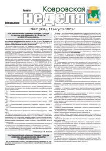 №62 (904), 11 августа 2023 г. ǺDzDZDzǸȌ ǸȜȐȞȜȐȟȘȎȭ Спецвыпуск Газета ПОСТАНОВЛЕНИЕ АДМИНИСТРАЦИИ ГОРОДА КОВРОВА ВЛАДИМИРСКОЙ ОБЛАСТИ №1800 ОТ 04.08.2023 г. О внесении изменений в постановление администрации города Коврова Владимирской области от 05.10.2015 №.2496 «Об оплате труда работников муниципальных учреждений отдыха и общего оздоровления детей и подростков» В соответствии со статьей 144 Трудового кодекса Российской Федерации, в целях реализации постановления Правительства Владимирской области от 23.06.2023 №432 «Об оплате труда работников государственных учреждений отрасли образования Владимирской области», постановления Правительства Владимирской области от 04.07.2023 №463 «О базовых окладах (базовых должностных окладах) профессиональных квалификационных групп общеотраслевых должностей руководителей, специалистов и служащих, базовых ставках заработной платы профессиональных квалификационных групп общеотраслевых профессий рабочих», постановления администрации города Коврова Владимирской области от 10.07.2023 №1545 «О базовых окладах (базовых должностных окладах) профессиональных квалификационных групп общеотраслевых должностей руководителей, специалистов и служащих, базовых ставках заработной платы профессиональных квалификационных групп общеотраслевых профессий рабочих» и на основании статей 31, 32 Устава муниципального образования город Ковров Владимирской области постановляю: 1. Внести в приложение к постановлению администрации города Коврова Владимирской области от 05.10.2015 №2496 «Об оплате труда работников муниципальных учреждений отдыха и общего оздоровления детей и подростков» следующие изменения: 1.1. Пункт 2.2. раздела 2 «Должностной оклад» Положения о системе оплаты труда работников муниципальных учреждений отдыха и общего оздоровления детей и подростков изложить в следующей редакции: «2.2. Размер базового должностного оклада, базовой ставки заработной платы составляет для профессиональной квалификационной группы должностей: 2.2.1. Учебно-вспомогательного персонала первого уровня – 3655 руб. 2.2.2. Учебно-вспомогательного персонала второго уровня – 4245 руб. 2.2.3. Общеотраслевые должности служащих первого уровня – 3677 руб. 2.2.4. Общеотраслевые должности служащих второго уровня – 3850 руб. 2.2.5. Общеотраслевые должности служащих третьего уровня – 4751 руб. 2.2.6. Общеотраслевые профессии рабочих первого уровня – 3392 руб. 2.2.7. Общеотраслевые профессии рабочих второго уровня – 3850 руб.». 2. Признать утратившим силу постановление администрации города Коврова Владимирской области от 14.10.2022 №2405 «О внесении изменений в постановление администрации города Коврова Владимирской области от 05.10.2015 №2496 «Об оплате труда работников муниципальных учреждений отдыха и общего оздоровления детей и подростков». 3. Контроль за исполнением настоящего постановления возложить на заместителя главы администрации по социальным вопросам. 4. Настоящее постановление вступает в силу со дня его официального опубликования и распространяет свое действие на правоотношения, возникшие с 01 июля 2023 года. Глава города Е.В. Фомина ПОСТАНОВЛЕНИЕ АДМИНИСТРАЦИИ ГОРОДА КОВРОВА ВЛАДИМИРСКОЙ ОБЛАСТИ №1805 ОТ 04.08.2023 г. Об установлении особого противопожарного режима на территории муниципального образования город Ковров Владимирской области В связи с прогнозируемым повышением 