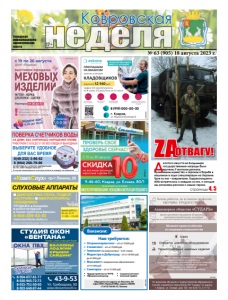 Городская информационноаналитическая газета неделя 12+ Ковровская НА ДОМУ, БЕЗ СНЯТИЯ,БЕЗ НАРУШЕНИЯ ПЛОМБ РАБОТАЕМ С 8.00 ДО 21.00 БЕЗ ОБЕДА И ВЫХОДНЫХ ИП ПЕТРОВА Ю.Г. АТТЕСТАТ АККРЕДИТАЦИИ RA. RU. 320031 ВЫДАН 28.04.2017 г. В случае непригодности счетчика оплата за поверку не взимается 8(49-232) 3-86-52 8 (904) 260-79-96 8-904-037-81-77 8-920-945-72-73 8-915-751-50-50 8-903-648-87-44 СТУДИЯ ОКОН «ВЕНТАНА» Тепло и уют в вашем доме реклама Ул. Грибоедова, 50 www.oknaventana33.ru 43-9-53 ЗАБЕРЕМ СТАРЫЕ РАМЫ ОКНА ПВХ СКИДКИ! до 30% Мы гарантируем качество и надежность! СУШИЛКА ДЛЯ БЕЛЬЯ В ПОДАРОК!* Принимаем оплату картой. *Подробности узнавайте по телефонам БАЛКОНЫ ЛОДЖИИ КРЫШИ САЙДИНГ Демонтаж бесплатно ИМЕЮТСЯ ПРОТИВОПОКАЗАНИЯ. ПРОКОНСУЛЬТИРУЙТЕСЬ СО СПЕЦИАЛИСТОМ реклама «КомпСлух» пр-т Ленина, 29 8-904-259-53-83 www.korrekcia-sluha.ru СЛУХОВЫЕ АППАРАТЫ ДИАГНОСТИКА СЛУХА, ПОДБОР, НАСТРОЙКА МИКРОАППАРАТЫ (НЕВИДИМКИ) ПРОДАЖА: батарейки ушные вкладыши тонкие трубочки фильтры вт, ср, чт, пт 11.00 –15.00 время работы Св. ИФНС РФ №8 по Влад.обл. 33 №001587735 ¾Оториноларинголог – з/п от 70000 руб. ¾Стоматолог – з/п от 70000 руб. ¾Гинеколог (на медосмотры) – 0,25 ставки. ¾Медсестра в Доброград – з/п от 38500 руб. до 41000 руб. ¾Массажист с медицинским образованием – з/п 41000 руб. ¾Санитарка – з/п от 21000 руб. Нам требуются: y Трудоустройство по ТК РФ y Официальный доход y Социальный пакет y Сменный график Обращаться по адресу: ул. Ватутина, 88 (офис ООО «Первый КМЦ», рядом с OZON) +7 (915) 760-89-37, Татьяна Вакансии: реклама страницы 4, 5 № 63 (905) 18 августа 2023 г. реклама реклама реклама Десятого августа во Владимире государственные награды были вручены 9 жителям региона, проявившим мужество и героизм в борьбе в нацизмом в ходе спецоперации на Украине. Трое из них – ковровчаме. Корреспонденты «КН» встретились с каждым из них, и сегодня мы начинаем рассказ о наших героях. ZАОТВАГУ!