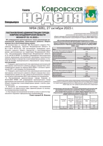 №84 (926), 27 октября 2023 г. ǺDzDZDzǸȌ ǸȜȐȞȜȐȟȘȎȭ Спецвыпуск Газета ПОСТАНОВЛЕНИЕ АДМИНИСТРАЦИИ ГОРОДА КОВРОВА ВЛАДИМИРСКОЙ ОБЛАСТИ №2459 ОТ 23.10.2023 г. Об утверждении краткосрочного плана реализации региональной программы капитального ремонта общего имущества в многоквартирных домах В соответствии со статьей 168 Жилищного кодекса Российской Федерации, Законом Владимирской области от 06.11.2013 №121-ОЗ «Об организации проведения капитального ремонта общего имущества в многоквартирных домах, расположенных на территории Владимирской области», Постановлением Губернатора Владимирской области от 01.04.2014 №303 «О порядке утверждения краткосрочных планов реализации региональной программы капитального ремонта общего имущества в многоквартирных домах» и статьей 32 Устава муниципального образования город Ковров, постановляю: 1. Утвердить краткосрочный план реализации региональной программы капитального ремонта общего имущества в многоквартирных домах на период 2023-2025г.г. согласно приложению №1 к настоящему постановлению. 2. Утвердить краткосрочный план реализации региональной программы капитального ремонта общего имущества в многоквартирных домах за счет средств регионального оператора согласно приложению №2 к настоящему постановлению. 3. Постановление администрации города Коврова от 30.03.2023 №594 «Об утверждении краткосрочного плана реализации региональной программы капитального ремонта общего имущества в многоквартирных домах» считать утратившим силу. 4. Контроль за исполнением настоящего постановления возложить на заместителя главы администрации по жилищно-коммунальному хозяйству. 5. Настоящее постановление вступает в силу со дня его подписания и подлежит официальному опубликованию. Глава города Е.В. Фомина Таблица №2 «к краткосрочному плану реализации региональной программы капитального ремонта общего имущества в многоквартирных домах на территории муниципального образования город Ковров на период 2023-2025 годы» «Источники финансирования краткосрочного плана реализации региональной программы капитального ремонта общего имущества в многоквартирных домах на территории муниципального образования город Ковров на период 20232025 годы» Источники финансирования Объем финансирования по 2023 г., руб. Всего 148 671 361,55 в том числе: Фонд содействия реформированию жилищно-коммунального хозяйства 0,00 Областной бюджет 0,00 Местные бюджеты 0,00 Средства собственников 148 671 361,55 Источники финансирования Объем финансирования по 2024 г., руб. Всего 114 287 794,21 в том числе: Фонд содействия реформированию жилищно-коммунального хозяйства 0,00 Областной бюджет 0,00 Местные бюджеты 0,00 Средства собственников 114 287 794,21 Источники финансирования Объем финансирования по 2025 г., руб. Всего 77 095 279,09 в том числе: Фонд содействия реформированию жилищно-коммунального хозяйства 0,00 Областной бюджет 0,00 Местные бюджеты 0,00 Средства собственников 77 095 279,09 Таблица №2 к краткосрочному плану реализации региональной программы капитального ремонта общего имущества в многоквартирных домах на территории муниципального образования город Ковров на 20232025 годы за счет средств регионального оператора» Прогноз реализации краткосрочного плана реализации региональной программы капитального ремонта общего имущества в многоквартирных домах на территории муниципального образования го
