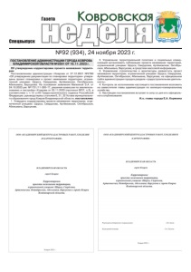 22 №92 24 ноября 2023 г. Владимирской области «Об административных правонарушениях во Владимирской области» от 14.02.2003 N 11-ОЗ. 1.4. Руководство и контроль за деятельностью комиссии осуществляет администрация города Коврова. 1.5. Комиссия имеет печать со своим наименованием, штампы, бланки. 2. ОСНОВНЫЕ ЗАДАЧИ КОМИССИИ 2.1. Основными задачами комиссии являются: 2.1.1. Защита законных интересов общества и государства, физических и юридических лиц от административных правонарушений. 2.1.2. Своевременное, всестороннее, полное и объективное выяснение обстоятельств каждого дела об административном правонарушении, предусмотренном законом Владимирской области. 2.1.3. Разрешение дел об административных правонарушениях, предусмотренных законами Владимирской области, в точном соответствии с законами Российской Федерации и Владимирской области, иными нормативными правовыми актами. 2.1.4. Исполнение и обеспечение исполнения постановлений по делам об административных правонарушениях. 2.1.5. Укрепление правопорядка и общественной безопасности. 2.1.6. Воспитание граждан в духе исполнения законов. 3. СОСТАВ КОМИССИИ 3.1. Комиссия формируется в составе председателя, заместителя (заместителей) председателя, ответственного секретаря, являющегося членом комиссии, и членов комиссии. 3.2. Председатель и его заместитель (заместители) избираются на заседании комиссии из числа членов административной комиссии. 3.3. Председатель, заместитель (заместители) председателя, члены комиссии выполняют свои полномочия без отрыва от основной трудовой деятельности на безвозмездной основе. 3.4. Ответственный секретарь комиссии является муниципальным служащим и работает на постоянной, оплачиваемой основе с финансированием за счет субвенций из областного бюджета бюджету муниципального образования. 3.5. В период временного отсутствия ответственного секретаря комиссии его обязанности исполняет один из членов комиссии, определяемый председателем комиссии. 4. УСЛОВИЯ И ПОРЯДОК ФОРМИРОВАНИЯ КОМИССИИ 4.1. Количественный состав комиссии составляет 10 человек. Персональный состав административной комиссии, а так же изменения по составу комиссии утверждаются постановлением администрации г. Коврова. 4.2. Не может быть назначено членом административной комиссии лицо, в отношении которого вступил в законную силу обвинительный приговор суда или оно имеет неснятую или непогашенную судимость, уволенное с государственной, муниципальной или правоохранительной службы за совершение проступков, несовместимых с его профессиональной деятельностью. 4.3. В состав комиссии могут входить депутаты Совета народных депутатов города Коврова Владимирской области, муниципальные служащие, должностные лица муниципальных учреждений и организаций муниципального образования город Ковров, представители областных и федеральных структур (по согласованию), а также имеющие высшее юридическое образование представители зарегистрированных в установленном порядке общественных объединений. 4.4. Полномочия членов комиссии могут быть досрочно прекращены в случаях: 4.4.1. Подачи членом комиссии заявления в письменной форме о прекращении своих полномочий Главе города. 4.4.2. Прекращения гражданства Российской Федерации. 4.4.3. Вступления в законную силу обвинительного приговора суда или судебного решения в отноше