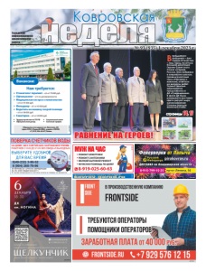 2 1 декабря 2023 г. Ковровскаянеделя № 93 события недели Дорогие ковровчане! Международный день инвалидов – это день милосердия и добра. Основная цель этой даты – напомнить, что люди с инвалидностью находятся в равных правах со всеми членами общества. Этот день объединяет всех, кто не остается равнодушным к мужеству людей с ограниченными возможностями здоровья, их упорству, талантам и способностям, умению настойчиво идти к намеченной цели. Вы обладаете удивительной силой воли и, несмотря на недуг, сохраняете радость жизни, ее добро и красоту. Многие из вас, преодолевая жизненные трудности, достигают успехов в учебе, науке, спорте, труде и творчестве. Ваша активная жизненная позиция и участие в общественно-политической жизни города вызывает уважение. Отдельные слова благодарности адресуем тем, кто занимается реабилитацией и социальной адаптацией людей с ограниченными возможностями здоровья, вдохновляет и мотивирует их, помогает, дарит заботу и внимание. Большое уважение вызывает деятельность общественных организаций инвалидов. Искренне желаем, чтобы ваши сила духа и воля не имели границ, оптимизма вам, высокого жизненного тонуса, внимания и понимая окружающих, тепла и любви близких, удачи и счастья! Глава города Елена Фомина Председатель Совета народных депутатов Анатолий Зотов Уважаемые юристы, ветераны юридического сообщества! Примите самые искренние и теплые поздравления с профессиональным праздником – Днем юриста! Этот праздник объединяет представителей органов юстиции, прокуратуры, судебной системы, следователей, сотрудников МВД, судебных приставов, адвокатов, нотариусов, юристов государственных органов власти и коммерческих организаций, студентов юридических факультетов и ученых правоведов, словом, всех тех, кто посвятил свою профессиональную деятельность юриспруденции. Сегодня без вашего участия не решается практически ни одно большое серьезное дело в любой сфере. Вы обеспечиваете соблюдение конституционных норм, помогаете людям отстаивать справедливость, стоите на страже законов и действуете в их рамках. Вы ведете большую работу по пропаганде правовых знаний, вашими консультациями пользуются специалисты и руководители разных отраслей, жители города. В этот день примите слова искренней признательности за ваш такой непростой, но очень необходимый труд, за высокое мастерство и самоотверженность, за преданность избранному делу. Желаем вам крепкого здоровья и профессиональных успехов, благополучия, терпения, мира и справедливости! Глава города Елена Фомина Председатель Совета народных депутатов Анатолий Зотов Уважаемые добровольцы и волонтеры! Поздравляем вас с Днем добровольца в России! Это праздник неравнодушных, ответственных и целеустремленных людей, которых объединяет общая цель – нести добро людям. Много сил и времени вы отдаете добровольческим проектам, поддерживаете тех, кто нуждается в помощи. Свою душу, свое сердце вы вкладываете в волонтерскую работу, бескорыстно служите обществу и стремитесь сделать этот мир лучше. Вы – те люди, которые помогают пожилым, заботятся о ветеранах, ухаживают за памятниками героям Великой Отечественной войны и захоронениями тружеников тыла, доставляют нуждающимся медикаменты, продуктовые наборы. Благодарим всех, кто вносит свой вклад в развитие волонтер