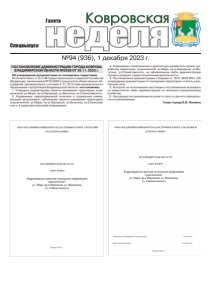 14 №94 1 декабря 2023 г. ПОСТАНОВЛЕНИЕ АДМИНИСТРАЦИИ ГОРОДА КОВРОВА ВЛАДИМИРСКОЙ ОБЛАСТИ №2809 ОТ 29.11.2023 г. О внесении изменений в приложение №1 к постановлению администрации города Коврова от 04.06.2021 №1096 «О создании муниципальной комиссии по обследованию жилых помещений инвалидов и общего имущества в многоквартирных домах, в которых проживают инвалиды на территории муниципального образования город Ковров» В соответствии с Постановлением Правительства РФ от 09.07.2016 №649 «О мерах по приспособлению жилых помещений и общего имущества в многоквартирном доме с учетом потребности инвалидов» на основании ст. 31, 32 Устава муниципального образования город Ковров Владимирской области, в связи с кадровыми изменениями, постановляю: 1. Внести изменения в постановление администрации города Коврова от 04.06.2021 №1096 «О создании муниципальной комиссии по обследованию жилых помещений инвалидов и общего имущества в многоквартирных домах, в которых проживают инвалиды на территории муниципального образования город Ковров», изложив его в редакции согласно приложению к настоящему постановлению. 2. Контроль за исполнением настоящего постановления возложить на заместителя главы администрации по жилищно-коммунальному хозяйству и начальника управления городского хозяйства. 3. Настоящее постановление вступает в силу со дня его официального опубликования. Глава города Е. В. Фомина Приложение к постановлению администрации города Коврова от 29.11.2023 №2809 СОСТАВ муниципальной комиссии по обследованию жилых помещений инвалидов и общего имущества в многоквартирных домах, в которых проживают инвалиды на территории муниципального образования город Ковров Председатель комиссии: Зубов Олег Олегович –Заместитель главы администрации по жилищно-коммунальному хозяйству Заместитель председателя комиссии: Лопатина Ольга Николаевна – Начальник управления строительства и архитектуры Секретарь комиссии: Алексеев Илья Михайлович – Экономист отдела жилищно-коммунального хозяйства управления городского хозяйства Члены комиссии: Петренко Екатерина Валерьевна – Начальник управления правового обеспечения и финансово-экономической безопасности Шнель Владимир Гукавич – Начальник отдела муниципального контроля и технического надзора Горюнов Юрий Владимирович – Начальник управления городского хозяйства Чернов Игорь Юрьевич – Директор ГКУ ВО «ОСЗН по г. Коврову и Ковровскому району» (по согласованию) Масленникова Татьяна Викторовна – Директор ГБУСО ВО «Ковровский комплексный центр социального обслуживания населения» (по согласованию) Павленко Ольга Владимировна –Председатель КГО ВООО «Всероссийское общество инвалидов» (по согласованию) Кулигина Нелли Ивановна –Председатель Ковровской МО «Всероссийское общество слепых» (по согласованию) Председатели организаций, осуществляющих деятельность по управлению многоквартир-ными домами – По согласованию ПОСТАНОВЛЕНИЕ АДМИНИСТРАЦИИ ГОРОДА КОВРОВА ВЛАДИМИРСКОЙ ОБЛАСТИ №2810 ОТ 30.11.2023 г. О внесении изменений в приложение к постановлению администрации города Коврова от 30.03.2020 №657 «Об установлении тарифов на дополнительные платные услуги, оказываемые Муниципальным бюджетным дошкольным образовательным учреждением детский сад №47» В соответствии с решением Совета народных депутатов города Коврова о