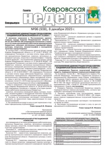 3 №96 8 декабря 2023 г. № пп Наименование МУНИЦИПАЛЬНОЕ БЮДЖЕТНОЕ УЧРЕЖДЕНИЕ КУЛЬТУРЫ ДОМ КУЛЬТУРЫ ИМЕНИ В.П. НОГИНА ПОСТАНОВЛЕНИЕ АДМИНИСТРАЦИИ ГОРОДА КОВРОВА ВЛАДИМИРСКОЙ ОБЛАСТИ №2865 ОТ 06.12.2023 г. О внесении изменений в постановление администрации города Коврова Владимирской области от 25.12.2020 №2444 «О расходовании средств, поступающих в виде субсидий и субвенций из областного бюджета, управлением образования администрации г.Коврова на 2021 год» В целях обеспечения эффективного расходования средств, поступающих в виде субсидий и субвенций из областного бюджета, руководствуясь статьями 6, 31, 32 Устава муниципального образования город Ковров Владимирской области постановляю: 1. Внести в постановление администрации города Коврова Владимирской области от 25.12.2020 №2444 «О расходовании средств, поступающих в виде субсидий и субвенций из областного бюджета, управлением образования администрации г.Коврова на 2021 год» следующие изменения: 1.1. Наименование Постановления изложить в следующей редакции: «О расходовании средств, поступающих в виде субсидий и субвенций из областного бюджета, управлением образования администрации г.Коврова» 1.2. В пункте 1: 1.2.1 абзац 3 изложить в следующей редакции « – на ежемесячное денежное вознаграждение за классное руководство педагогическим работникам муниципальных общеобразовательных организаций, реализующих образовательные программы начального общего образования, образовательные программы основного общего образования, образовательные программы среднего общего образования». 1.2.2 абзац 11 изложить в следующей редакции « – на благоустройство зданий муниципальных общеобразовательных организаций в целях соблюдения требований к воздушно-тепловому режиму, водоснабжению и канализации. 1.3. Из пункта 1 исключить абзац 12. 1.4. Пункт 1 дополнить абзацами следующего содержания: « – на осуществление в 2023 году премиальной выплаты педагогическим работникам муниципальных образовательных организаций области по итогам работы за 2022/2023 учебный год; – на дополнительное финансовое обеспечение деятельности групп продленного дня в муниципальных и частных общеобразовательных организациях для обучающихся 1 классов на 2023 год; – на проведение мероприятий по обеспечению деятельности советников директора по воспитанию и взаимодействию с детскими общественными объединениями в общеобразовательных организациях; – на поддержку организаций в сфере образования; – на укрепление материально-технической базы муниципальных образовательных организаций». 2. Контроль за исполнением настоящего постановления возложить на заместителя главы администрации по социальным вопросам. 3. Настоящее постановление вступает в силу со дня его официального опубликования. Глава города Е.В. Фомина ПОСТАНОВЛЕНИЕ АДМИНИСТРАЦИИ ГОРОДА КОВРОВА ВЛАДИМИРСКОЙ ОБЛАСТИ №2866 ОТ 07.12.2023 г. О внесении изменений в приложение к постановлению администрации города Коврова Владимирской области от 08.11.2021 №2290 «Об утверждении муниципальной программы «Обеспечение доступным и комфортным жильем населения города Коврова» В соответствии со ст.16 Федерального закона от 06.10.2003 №131-ФЗ «Об общих принципах организации местного самоуправления в Российской Федерации», руководствуясь ст. 179 Бюджетного кодекса Российской Федерации, на основании Устава муниципально