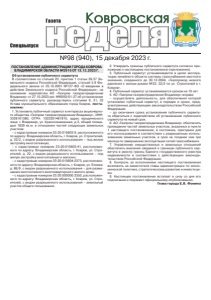 №98 (940), 15 декабря 2023 г. ǺDzDZDzǸȌ ǸȜȐȞȜȐȟȘȎȭ Спецвыпуск Газета ПОСТАНОВЛЕНИЕ АДМИНИСТРАЦИИ ГОРОДА КОВРОВА ВЛАДИМИРСКОЙ ОБЛАСТИ №2916 ОТ 13.12.2023 Г. Об установлении публичного сервитута В соответствии со статьей 23, пунктом 1 статьи 39.37 Земельного кодекса Российской Федерации, статьей 3.9 Федерального закона от 25.10.2001 №137-ФЗ «О введении в действие Земельного кодекса Российской Федерации», на основании ходатайства АО «Газпром газораспределение Владимир» от 27.10.2023 рег. №6000/01-27 об установлении публичного сервитута, руководствуясь статьями 6, 31, 32 Устава муниципального образования город Ковров, постановляю: 1. Установить публичный сервитут в интересах акционерного общества «Газпром газораспределение Владимир», ИНН: 3328101380, ОГРН: 1023301461810, адрес юридического лица: г. Владимир, ул. Краснознаменная, д.3, общей площадью 1839 кв.м. в отношении частей следующих земельных участков: – с кадастровым номером 33:20:015603:9, расположенного по адресу: Владимирская область, г. Ковров, ул. Строителей, д. 22/2, с видом разрешенного использования – под жилую застройку многоэтажную; – с кадастровым номером 33:20:015603:41, расположенного по адресу: Владимирская область, г. Ковров, ул. Строителей, д. 22, с видом разрешенного использования – под жилую застройку многоэтажную и магазин; – с кадастровым номером 33:20:015604:2373, расположенного по адресу: Владимирская область, г. Ковров, ул. Еловая, д. 86/9, с видом разрешенного использования – для размещения многоэтажного многоквартирного жилого дома; – с кадастровым номером 33:20:000000:3350, расположенного по адресу: Владимирская область, г. Ковров, ул. Строителей, с видом разрешенного использования – земельный участок общего пользования. 2. Утвердить границы публичного сервитута согласно приложению к настоящему постановлению (приложение). 3. Публичный сервитут устанавливается в целях эксплуатации линейного объекта системы газоснабжения местного значения, созданного до 30.12.2004, «Газопровод низкого давления к жилым домам №22, 22/2 по ул. Строителей в г. Ковров». 4. Публичный сервитут устанавливается сроком на 10 лет. 5. АО «Газпром газораспределении Владимир» вправе: – осуществлять деятельность, для обеспечения которой установлен публичный сервитут, в порядке и сроки, предусмотренные действующим законодательством Российской Федерации; – до окончания срока установления публичного сервитута обратиться с ходатайством об установлении публичного сервитута на новый срок. 6. АО «Газпром газораспределение Владимир» обеспечить приведение частей земельных участков, указанных в пункте 1 настоящего постановления, в состояние, пригодное для его использования в соответствии с разрешенным использованием земельных участков, в срок не позднее чем три месяца по завершению эксплуатации сетей газоснабжения. 7. Управлению имущественных и земельных отношений обеспечить внесение сведений о границах публичного сервитута в реестр границ Единого государственного реестра недвижимости в соответствии с действующим законодательством Российской Федерации. 8. Контроль за исполнением настоящего постановления возложить на заместителя главы администрации по экономической политике, стратегическому развитию и инвестициям. 9. Настоящее постановление вступает в силу со дня его подписания и подлежит официальному опубликованию. Глава города Е.В. Фомина