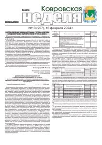 №13 (957), 16 февраля 2024 г. ǺDzDZDzǸȌ ǸȜȐȞȜȐȟȘȎȭ Спецвыпуск Газета ПОСТАНОВЛЕНИЕ АДМИНИСТРАЦИИ ГОРОДА КОВРОВА ВЛАДИМИРСКОЙ ОБЛАСТИ №242 ОТ 14.02.2024 г. Об изменении условий концессионного соглашения в отношении недвижимого и технологически связанного с ним движимого имущества от 26.10.2016 В соответствии с Федеральным законом РФ от 21.07.2005 №115-ФЗ «О концессионных соглашениях», Федеральным законом РФ от 06.10.2003 №131-ФЗ «Об общих принципах организации местного самоуправления в РФ», Федеральным законом РФ от 26.07.2006 №135-ФЗ «О защите конкуренции», п. 12 решения Совета народных депутатов города Коврова от 17.01.2001 №2/1 «Об утверждении общего порядка управления и распоряжения муниципальной собственностью г.Ковров», решением Совета народных депутатов города Коврова от 05.04.2016 №67 «О даче согласия администрации города Коврова на принятие решения о заключении концессионного соглашения», руководствуясь ст. 31, 32, 35, 46 Устава муниципального образования город Ковров, постановляю: 1. Изменить условия концессионного соглашения в отношении недвижимого и технологически связанного с ним движимого имущества на территории муниципального образования город Ковров от 26.10.2016 года путем заключения дополнительного соглашения №7 в редакции согласно приложению к настоящему постановлению. 2. Контроль за исполнением настоящего постановления возложить на заместителя главы администрации по жилищно-коммунальному хозяйству. 3. Настоящее постановление вступает в силу со дня его подписания и подлежит официальному опубликованию. Глава города Е.В. Фомина Приложение к постановлению администрации г. Коврова от 14.02.2024 №242 ДОПОЛНИТЕЛЬНОЕ СОГЛАШЕНИЕ №7 к Концессионному соглашению от 26.10.2016 в отношении недвижимого и технологически связанного с ним движимого имущества на территории муниципального образования город Ковров г. Ковров Владимирской области «___» _______2024 года Муниципальное образование город Ковров Владимирской области, именуемое в дальнейшем «Концедент», от имени которого выступает администрация города Коврова Владимирской области, действующая на основании решения Совета народных депутатов муниципального образования город Коврова Владимирской области от 05.04.2016 №67 «О даче согласия администрации города Коврова на принятие решения о заключении концессионного соглашения в отношении муниципального имущества», постановления администрации города Коврова Владимирской области от 24.10.2016 №3189 «Об итогах открытого конкурса на право заключения концессионного соглашения на проектирование, создание, реконструкцию и ввод в эксплуатацию объектов теплоснабжения, осуществление теплоснабжения, горячего водоснабжения с использованием объекта соглашения», в лице главы города Коврова Фоминой Елены Владимировны, действующей на основании Устава муниципального образования город Ковров Владимирской области, действующее на стороне Концедента муниципальное унитарное предприятие города Коврова «Жилэкс», именуемое в дальнейшем «Предприятие», в лице директора Некрасова Игоря Вячеславовича, действующего на основании Устава, с одной стороны, и Общество с ограниченной ответственностью «Владимиртеплогаз» (далее – ООО «Владимиртеплогаз»), именуемое в дальнейшем «Концессионер», в лице генерального директора Никитина Сергея Сергеевича, действующего на основании Устава, с друг
