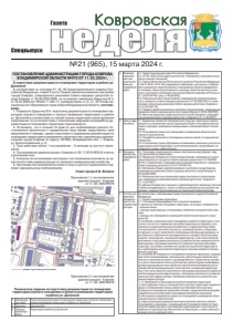 4 №21 15 марта 2024 г. ПОСТАНОВЛЕНИЕ АДМИНИСТРАЦИИ ГОРОДА КОВРОВА ВЛАДИМИРСКОЙ ОБЛАСТИ №526 ОТ 14.03.2024 г. Об утверждении краткосрочного плана реализации региональной программы капитального ремонта общего имущества в многоквартирных домах В соответствии со статьей 168 Жилищного кодекса Российской Федерации, Законом Владимирской области от 06.11.2013 №121-ОЗ «Об организации проведения капитального ремонта общего имущества в многоквартирных домах, расположенных на территории Владимирской области», Постановлением Губернатора Владимирской области от 01.04.2014 №303 «О порядке утверждения краткосрочных планов реализации региональной программы капитального ремонта общего имущества в многоквартирных домах» и статьей 32 Устава муниципального образования город Ковров, постановляю: 1. Утвердить краткосрочный план реализации региональной программы капитального ремонта общего имущества в многоквартирных домах на период 2023-2025г.г. согласно приложению №1 к настоящему постановлению. 2. Утвердить краткосрочный план реализации региональной программы капитального ремонта общего имущества в многоквартирных домах за счет средств регионального оператора согласно приложению №2 к настоящему постановлению. 3. Постановление администрации города Коврова от 23.01.2024 №71 «Об утверждении краткосрочного плана реализации региональной программы капитального ремонта общего имущества в многоквартирных домах» считать утратившим силу. 4. Контроль за исполнением настоящего постановления возложить на заместителя главы администрации по жилищно-коммунальному хозяйству. 5. Настоящее постановление вступает в силу со дня его подписания и подлежит официальному опубликованию. Глава города Е.В. Фомина Приложение № 1 к постановлению администрации города от 14. 03. 2024 № 526 № п/п Адрес многоквартирного дома (далее - МКД) Стоимость капитального ремонта ВСЕГО виды, установленные ч.1 ст.166 Жилищного Кодекса РФ виды, установленные нормативным правовым актом субъекта РФ Срок выполнения проектной документации Срок выполнения запланированных строительно - монтажных работ (уточняется по видам) Срок оказания услуги по строительному контролю ремонт внутридомовых инженерных систем ремонт или замена лифтового оборудования ремонт крыши ремонт подвальных помещений ремонт фасада ремонт фундамента замена плоской кровли на стропильную капитальный ремонт внутридомовых инженерных систем вентиляции и дымоудаления при капитальном ремонте крыш ремонт внутридомовых инженерных систем теплоснабжения с заменой отопительных приборов (радиаторов) в местах общего пользования и отопительных приборов (радиаторов), расположенных в жилых помещениях, не имеющих отключающих устройств устройство вновь выгребных ям или отстойников с биологической очисткой сточных вод (септиков) при отсутствии централизованной системы канализации утепление фасадов ремонт выпусков системы водоотведения до первого смотрового колодца при капитальном ремонте внутридомовых инженерных систем водоотведения установка узлов управления и регулирования потребления ресурсов, необходимых для предоставления коммунальных услуг (тепловой энергии, горячей и холодной воды, электрической энергии, газа), с оборудованием устройств автоматизации и диспетчеризации, при проведении капитального ремонта внутридомовых 