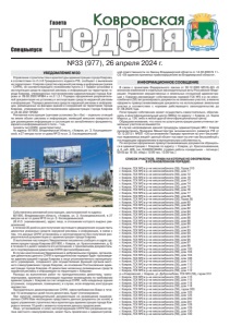 №33 (977), 26 апреля 2024 г. ǺDzDZDzǸȌ ǸȜȐȞȜȐȟȘȎȭ Спецвыпуск Газета УВЕДОМЛЕНИЕ №30 Управление строительства и архитектуры администрации города Коврова, в соответствии пп.2 ст.8 Гражданского кодекса РФ, сообщает о выявлении на территории г. Коврова средства наружной рекламы и информации (далее – СНРИ), не соответствующего положениям пункта 3.1 Правил установки и эксплуатации средств наружной рекламы и информации на территории города Коврова, утвержденных постановлением администрации города Коврова от 09.06.2020 №984 и пп.2.1,3.1 Порядка оформления разрешительной документации на установку и эксплуатацию средств наружной рекламы и информации. Порядка демонтажа средств наружной рекламы и информации, размещенных на фасадах зданий и сооружений на территории города Коврова, утвержденного постановлением администрации города Коврова от 24.02.2021 №382: Рекламная конструкция (щитовая установка 3м x 6м) – отдельно стоящий на земле объект рекламы и информации, имеющий внешние поверхности для размещения информации и состоящие из заглубляемого фундамента, каркаса и информационного поля – 1 ед. (указать тип СНРИ, характеристику) по адресу: 601900, Владимирская область, г.Ковров, ул. З. Космодемьянской, в 27 метрах на юг от дома №13 по ул. З. Космодемьянской. Собственнику рекламной конструкции, расположенной по адресу: 601900, Владимирская область, г.Ковров, ул. З. Космодемьянской, в 27 метрах на юг от дома №13 по ул. З. Космодемьянской. (Ф.И.О. (наименование), адрес лица, в отношении которого выдано уведомление) в течение 30 дней со дня получения настоящего уведомления осуществить демонтаж указанных средств наружной рекламы и информации, в связи с тем, что данные СНРИ установлены и эксплуатируются без получения разрешительной документации от администрации города Коврова. О выполнении настоящего Уведомления письменно сообщить в адрес администрации города Коврова (601900, г. Ковров, ул. Краснознаменная, д. 6) в течение 3-х дней с момента его исполнения, с приложением документального подтверждения демонтажа СНРИ (фотоизображение). В случае неисполнения Уведомления в добровольном порядке, организация демонтажа данного СНРИ в принудительном порядке будет произведена администрацией города Коврова в лице уполномоченного муниципального учреждения, созданного для осуществления функций органов местного самоуправления города Коврова, на основании Постановления администрации города Коврова «О демонтаже незаконно размещенных средств наружной рекламы и информации на территории г. Коврова». Расходы за выполнение работ по принудительному демонтажу, транспортировке, хранению и утилизации подлежат возмещению по требованию администрации г. Коврова за счет владельца СНРИ, либо владельца здания (строения, сооружения, помещения), в случае, если владелец конструкции неизвестен. Принудительно демонтированное СНРИ, невостребованное Вами в течение 15 календарных дней после демонтажа, будет утилизировано. При наличии разрешительной документации на размещение вышеуказанных СНРИ Вам необходимо представить данные документы (их копии) в адрес управления строительства и архитектуры администрации города Коврова в течение 10 дней с момента получения данного предписания. Лицо, установившее и (или) эксплуатирующее СНРИ без разрешения органа местного самоуправления, может быть привлечено к а