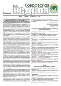 №41 (985), 24 мая 2024 г. ǺDzDZDzǸȌ ǸȜȐȞȜȐȟȘȎȭ Спецвыпуск Газета ПОСТАНОВЛЕНИЕ АДМИНИСТРАЦИИ ГОРОДА КОВРОВА ВЛАДИМИРСКОЙ ОБЛАСТИ ОТ 23.05.2024 №1111 О внесении изменений в приложения к постановлению администрации города Коврова Владимирской области от 21.12.2023 №3000 «О мерах по организации отдыха, оздоровления и занятости детей и подростков в 2024 году» В целях организации оздоровительной кампании детей 2023 года, в соответствии с п.13 ст. 16 Федерального закона от 06.10.2003 №131-ФЗ «Об общих принципах организации местного самоуправления в Российской Федерации», Указом Губернатора Владимирской области от 13.10.2022 №158 «О мерах поддержки участников специальной военной операции и членов их семей на территории Владимирской области», постановлением администрации Владимирской области от 31.01.2019 №48 «О Государственной программе Владимирской области «Развитие образования», на основании статей 6, 32, 35 Устава муниципального образования город Ковров Владимирской области постановляю: 1. Внести в приложения к постановлению администрации города Коврова Владимирской области от 21.12.2023 №3000 «О мерах по организации отдыха, оздоровления и занятости детей и подростков в 2024 году» следующие изменения: 1.1. приложение №1 «Состав Координационного Совета по организации отдыха, оздоровления и занятости детей и подростков», приложение №3 «Состав межведомственной комиссии по приемке загородных оздоровительных и палаточных лагерей», приложение №4 «Состав комиссии по распределению профильных мест в загородных оздоровительных лагерях» к постановлению изложить в новой редакции согласно приложению к настоящему постановлению; 1.2. в приложении №2 «Положение об организации отдыха детей в лагерях с дневным пребыванием, в профильных сменах на базе муниципальных загородных оздоровительных лагерей, культурно-экскурсионного обслуживания детей» к постановлению подпункт 2.8. изложить в следующей редакции: «2.8. Во внеочередном порядке места в оздоровительные лагеря с дневным пребыванием на базе организаций города и муниципальные загородные оздоровительные лагеря предоставляются: 2.8.1. детям (пасынкам, падчерицам) постоянно проживающих на территории Владимирской области граждан Российской Федерации, призванных на военную службу по мобилизации в Вооруженные Силы Российской Федерации, на период прохождения ими военной службы; 2.8.2. детям (пасынкам, падчерицам) постоянно проживающих на территории Владимирской области граждан Российской Федерации, добровольно изъявивших желание принять участие в специальной военной операции в составе добровольческих отрядов, на период прохождения ими военной службы; 2.8.3. детям (пасынкам, падчерицам) постоянно проживающих на территории Владимирской области граждан Российской Федерации, пребывавших в запасе и заключивших после 24 февраля 2022 года контракт о прохождении военной службы в Вооруженных Силах Российской Федерации в зоне специальной военной операции, на период прохождения ими военной службы; 2.8.4. детям (пасынкам, падчерицам) постоянно проживающих на территории Владимирской области граждан Российской Федерации из числа военнослужащих, проходящих военную службу по контракту в Вооруженных Силах Российской Федерации и принимающих участие в специальной военной операции, на период прохождения ими военной службы; 2.8.5. детям (пасынкам, пад