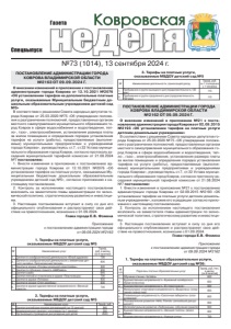 №73 (1014), 13 сентября 2024 г. ǺDzDZDzǸȌ ǸȜȐȞȜȐȟȘȎȭ Спецвыпуск Газета ПОСТАНОВЛЕНИЕ АДМИНИСТРАЦИИ ГОРОДА КОВРОВА ВЛАДИМИРСКОЙ ОБЛАСТИ №2163 ОТ 09.09.2024 Г. О внесении изменений в приложение к постановлению администрации города Коврова от 12.10.2021 №2076 «Об установлении тарифов на дополнительные платные услуги, оказываемые Муниципальным бюджетным дошкольным образовательным учреждением детский сад №5» В соответствии с решением Совета народных депутатов города Коврова от 25.03.2020 №75 «Об утверждении положения о разграничении полномочий, предоставленных органам местного самоуправления муниципального образования город Ковров в сфере водоснабжения и водоотведения, тепло-, газо-, электроснабжения, установления размера платы за жилое помещение и определения порядка установления тарифов на услуги (работы), предоставляемые (выполняемые) муниципальными предприятиями и учреждениями города Коврова», руководствуясь ст.7, ст.32 Устава муниципального образования город Ковров, согласно протоколу заседания муниципальной тарифной комиссии от 21.08.2024 №7 постановляю: 1. Внести изменения в приложение к постановлению администрации города Коврова от 12.10.2021 №2076 «Об установлении тарифов на платные услуги, оказываемые Муниципальным бюджетным дошкольным образовательным учреждением детский сад №5», согласно приложению к настоящему постановлению. 2. Контроль за исполнением настоящего постановления возложить на заместителя главы администрации по экономической политике, стратегическому развитию и инвестициям. 3. Настоящее постановление вступает в силу со дня его официального опубликования и распространяет свое действие на правоотношения, возникшие с 01.09.2024. Глава города Е.В. Фомина Приложение к постановлению администрации города от 09.09.2024 №2163 1. Тарифы на платные услуги, оказываемые МБДОУ детский сад №5 № Наименование услуг Тариф, руб. в месяц (за 8 занятий) 1. Занятия по изобразительной деятельности «Юный художник» 700 2. Занятия по изобразительной деятельности с элементами детского дизайна «Творческая мастерская» 800 3. Занятия в кружке «Основы начальной хореографии» 240 4. Занятия по обучению грамоте «АБВГдейка» 900 5. Занятия самбо 640 6. Занятия лепкой из пластилина в кружке «Пластилишка» 700 7. Занятия в кружке «Ритмика» 800 8. Занятия в кружке «Степ аэробика» 800 9. Занятия в кружке художественной направленности «Веселый оркестр» 700 2. Тарифы на платные услуги, оказываемые МБДОУ детский сад №5 № Наименование услуг Тариф, руб. 1. Занятия английским языком для малышей (за 12 занятий) 840 2. Индивидуальное занятие с логопедом (за 1 занятие) 550 3. Организация и проведение дня рождения для детей 2500 3. Тарифы на платные услуги, оказываемые МБДОУ детский сад №5 № Наименование деятельности, приносящей доход Тариф, руб. за 1 посещение с 1 человека 1. Пребывание в группе выходного дня (продолжительность 120 мин) 110 2. Пребывание в группе продленного дня (продолжительность 120 мин) 110 ПОСТАНОВЛЕНИЕ АДМИНИСТРАЦИИ ГОРОДА КОВРОВА ВЛАДИМИРСКОЙ ОБЛАСТИ №2162 ОТ 09.09.2024 Г. О внесении изменений в приложение №21 к постановлению администрации города Коврова от 02.09.2015 №2193 «Об установлении тарифов на платные услуги детским дошкольным учреждениям» В соответствии с решением Совета народных депутатов города Коврова от 25.03.2020 №75 «Об утверждении положения о разграничении полномочий, предоставленных органам 