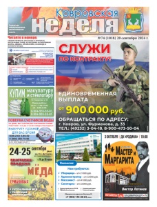 реклама Уборщица – з/п 21000 руб. Администратор – з/п 32000 руб. Массажист – з/п 41000 руб. Санитарка – з/п 22000 руб. Нам требуются:  Трудоустройство по ТК РФ  Официальный доход  Социальный пакет  Сменный график Обращаться по адресу: ул. Ватутина, 90 +7 (905) 144-38-64, Нина Вакансии: реклама 12+ свежие новости, рассказы о земляках, актуальные темы, культурная и спортивная жизнь, афиша, объявления, сканворд и немного юмора. Читайте в номере: реклама Городская информационноаналитическая газета ɇȺ ȾɈɆɍ ȻȿɁ ɋɇəɌɂə ȻȿɁ ɇȺɊɍɒȿɇɂə ɉɅɈɆȻ ɊȺȻɈɌȺȿɆ ɋ ȾɈ ȻȿɁ ɈȻȿȾȺ ɂ ȼɕɏɈȾɇɕɏ ɂɉ ɉȿɌɊɈȼȺ ɘ Ƚ ȺɌɌȿɋɌȺɌ ȺɄɄɊȿȾɂɌȺɐɂɂ 5$ 58 ȼɕȾȺɇ ɝ ȼ ɫɥɭɱɚɟ ɧɟɩɪɢɝɨɞɧɨɫɬɢ ɫɱɟɬɱɢɤɚ ɨɩɥɚɬɚ ɡɚ ɩɨɜɟɪɤɭ ɧɟ ɜɡɢɦɚɟɬɫɹ Ковровская др №74 (1018) 20 сентября 2024 г. реклама вьыставкапродажа 24-25ñåíòÿáðÿ ñ 10ÂÌ 18Õ¾ÏÌÀ ÌÐ ÍÌÐÌÊÏÐÀÃËËÙõ ïÕÃÉÌÀÌÂÌÀ ÅÐÌÀÊÎÂÛÕ реклама 0+ натуральньый мёд продукция пчеловодства п п ДКиО им. В.А. Дегтярёва ул. Социалистическая, 5 реклама КУПИМ макулатуру и стеклотару Ул. Свердлова, д. 91 Режим работы: пн-пт – 7.00-17.00, сб – 8.00-14.00 8-904-955-55-01, 8-904-955-55-81